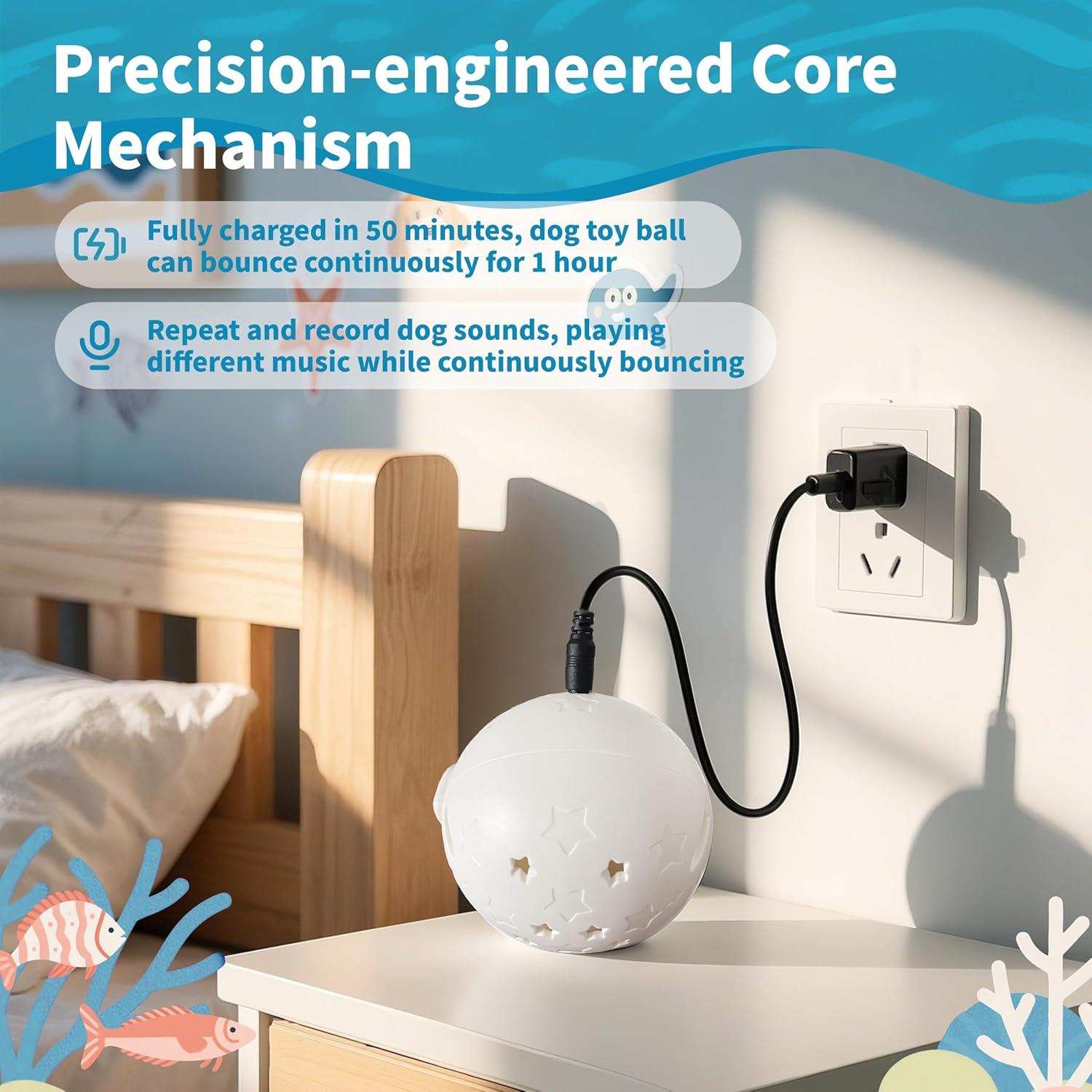 [Rechargeable Dog Toy Ball]: Equipped with a USB charging cable, this automatic puppy interactive toy in 50 minutes for up to an hour of continuous vibration. Featuring a precision-engineered core mechanism designed for long-lasting durability. Easy to use: press the power button to activate the rolling ball, enter recording mode to capture and playback sounds, gently tap the dog toy to switch into musical rolling mode with rhythmic vibrations.