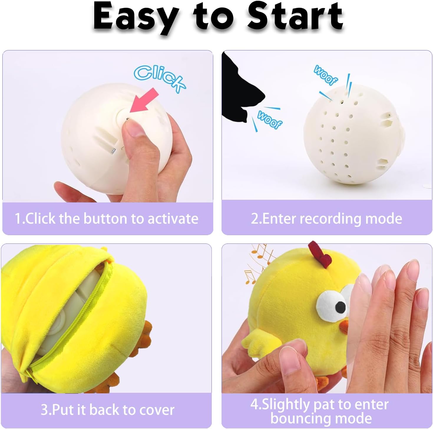 Music & Recording: Turn on the switch and tap the toy to automatically play songs and beats. If the owner or pet makes a sound, the recording mode will be turned on to imitate and play the recording. Then tap the toy to continue playing music and bouncing.