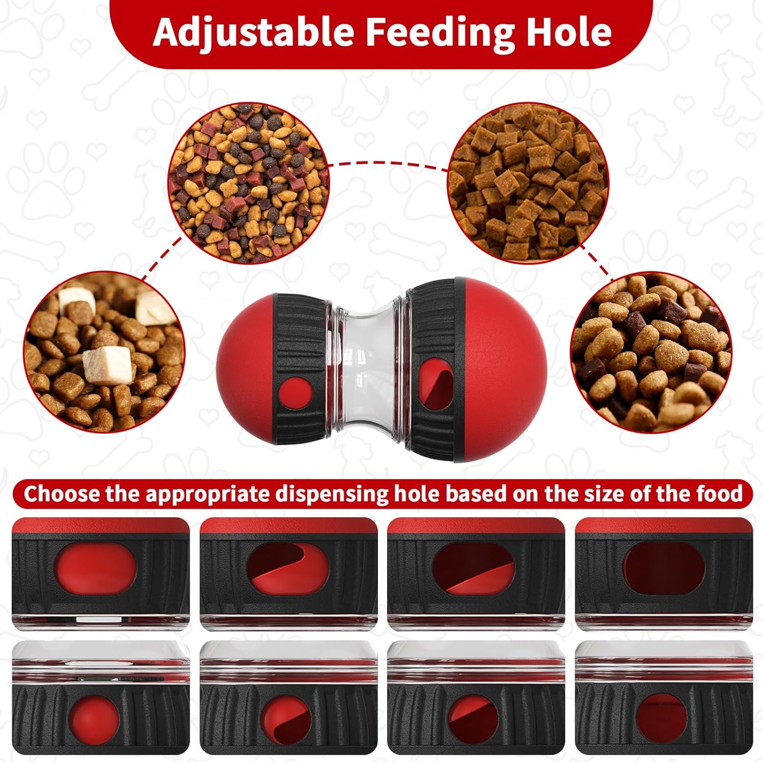 Suitable for Different Types of Food: The various sizes of the feeding holes can accommodate different types and sizes of dog food and treats, making this toy more versatile and practical.