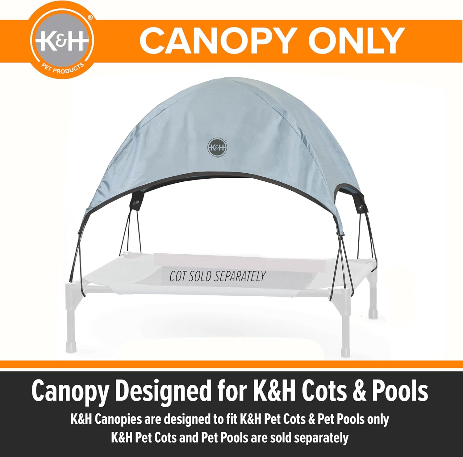 The K&H Pet Canopy (Cot or Pool Sold Separately) shades any pet from harsh summer sunlight. Designed to attach to any K&H Pet Products pet cot or K&H Pet Pool of like size, guaranteeing to help your dog have a cool summer! The simple design just plugs into the corners of the K&H cot and pools and safely secures with bungee straps riveted in the corners. This is the easiest, simplest design on the market. Designed by K&H with OVER 20 years of experience in creating safe, innovative, quality products for pets: one-year limited warranty. NOTE: Only compatible with K&H Pet Products Pet Cots or Pools of like size, be sure to measure your K&H pet cot or pool to ensure you purchase the correct size.
