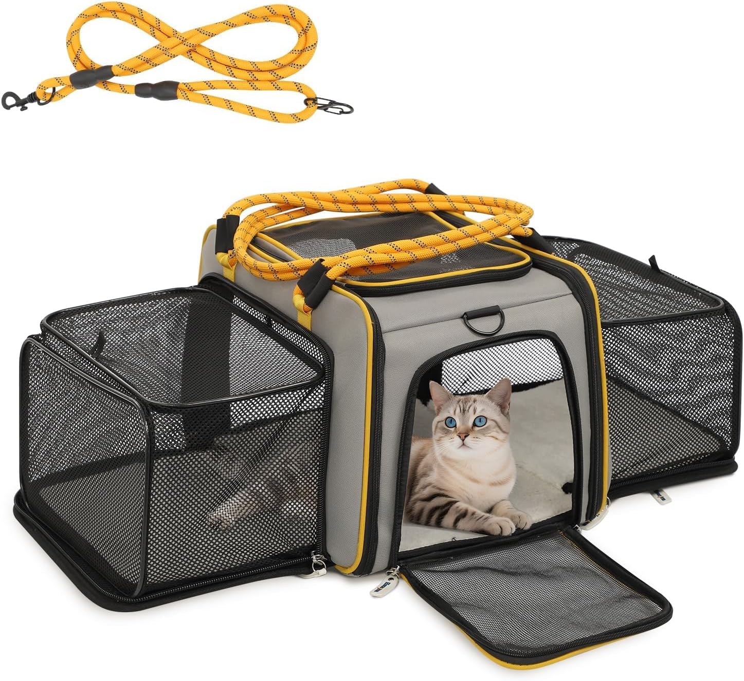 MAXIMUM AIR CIRCULATION & MULTIPLE ENTRANCES: Mesh windows on 4 sides for optimal airflow, 4 entrances (sides, front, and back) allow your pet to enjoy the outside scenery and easy entry into the carrier, and 1 expandable soft mat to keep your pet comfy during the journey
