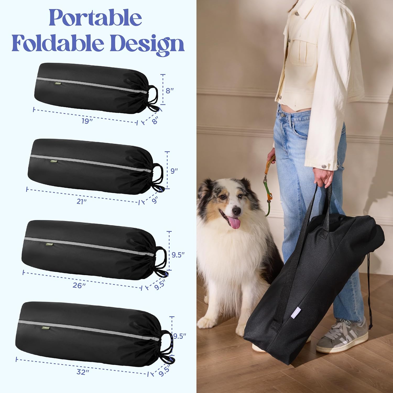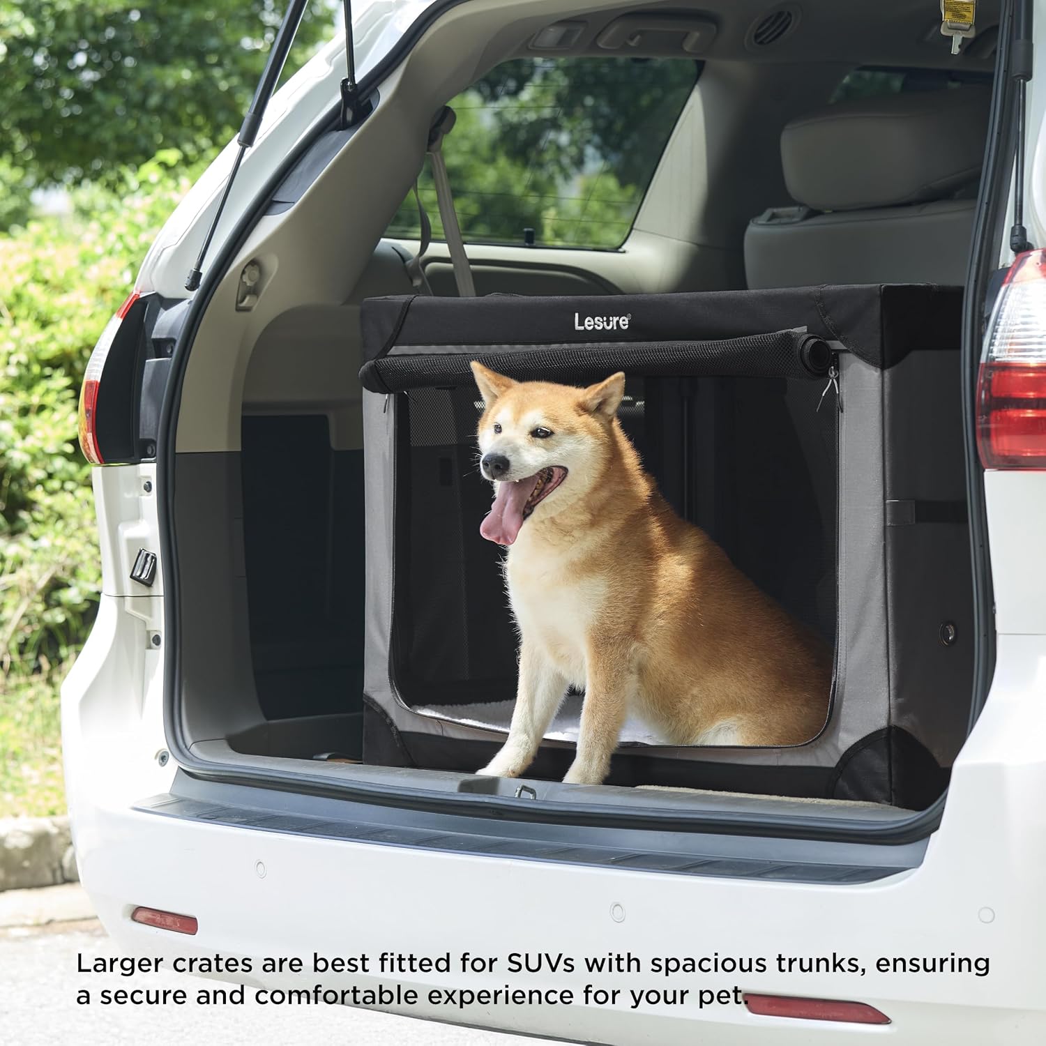 Enhanced Safety: This crate features a sturdy iron frame that maintains structural integrity. Reflective strips on both sides provide visibility for your pet’s safety. The self-locking zipper system prevents escapes, while the mesh offers secure containment. An integrated leash adds an additional safety measure.