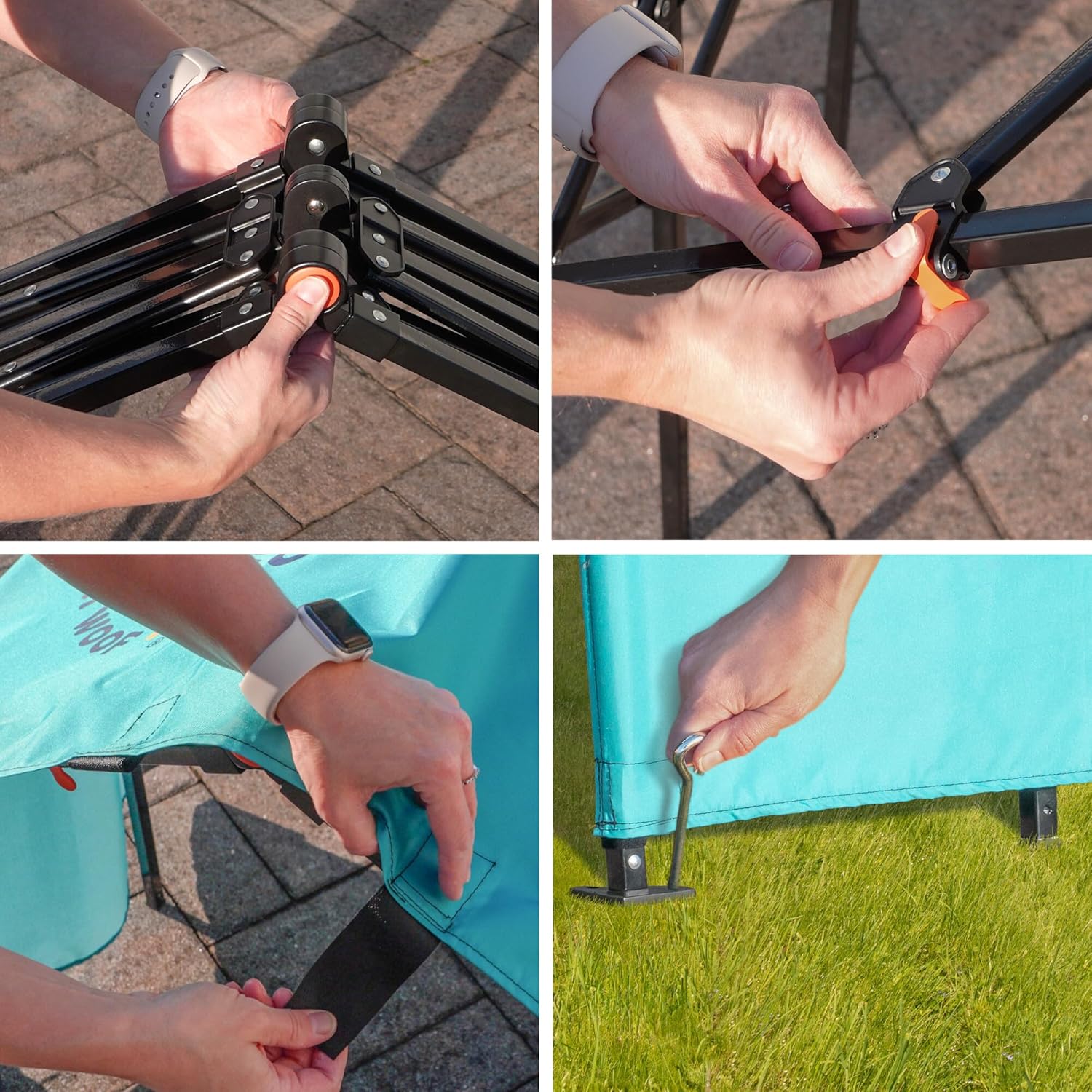 EASY ASSEMBLY: Just unfold it, spread it open, and push a button to lock the dog shade canopy into place, making it easy to transport to the park, campground, beach, or anywhere your pet needs shade
