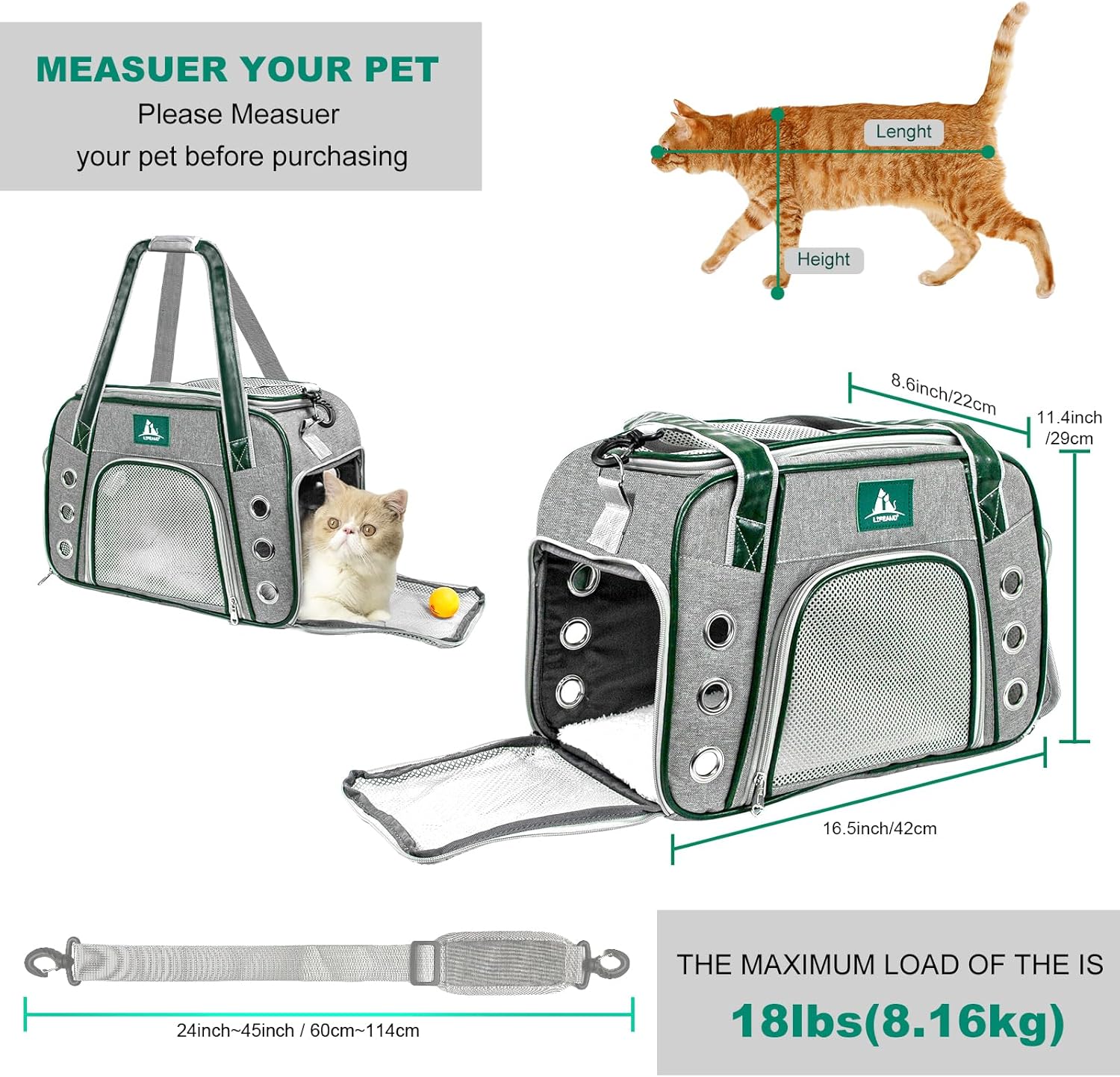 Spacious and Secure: Our cat carrier measures 17×11.4×8.7 inches, providing plenty of room for your feline friend. It can safely accommodate cats weighing up to 18 pounds, ensuring a secure and comfortable travel experience.