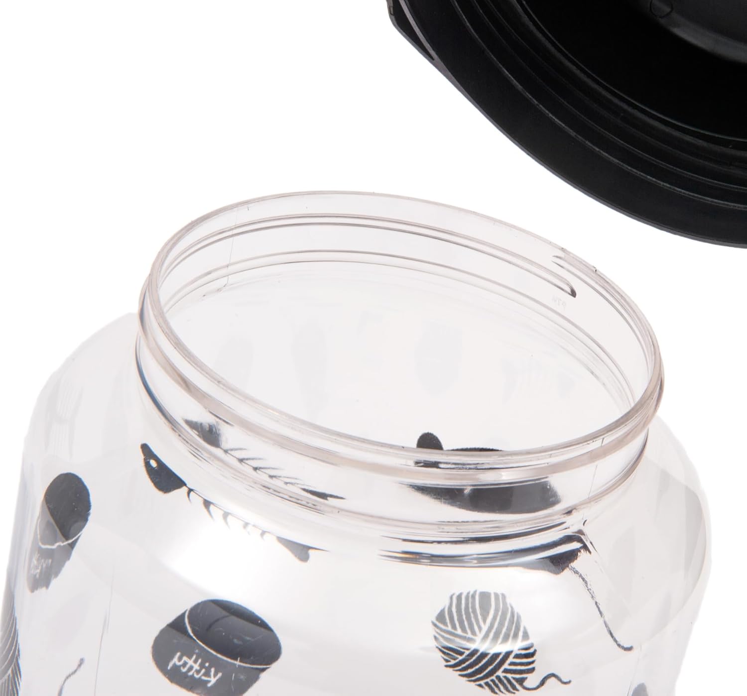 Wide mouth treat jar is screened with dog bones that match the dark gray lid. Air tight lid keeps food and treats fresh. Wide mouth makes it easy to reach in and grab a treat. Can be used to store treats or kibble. Treats not included. 64-Ounce capacity.