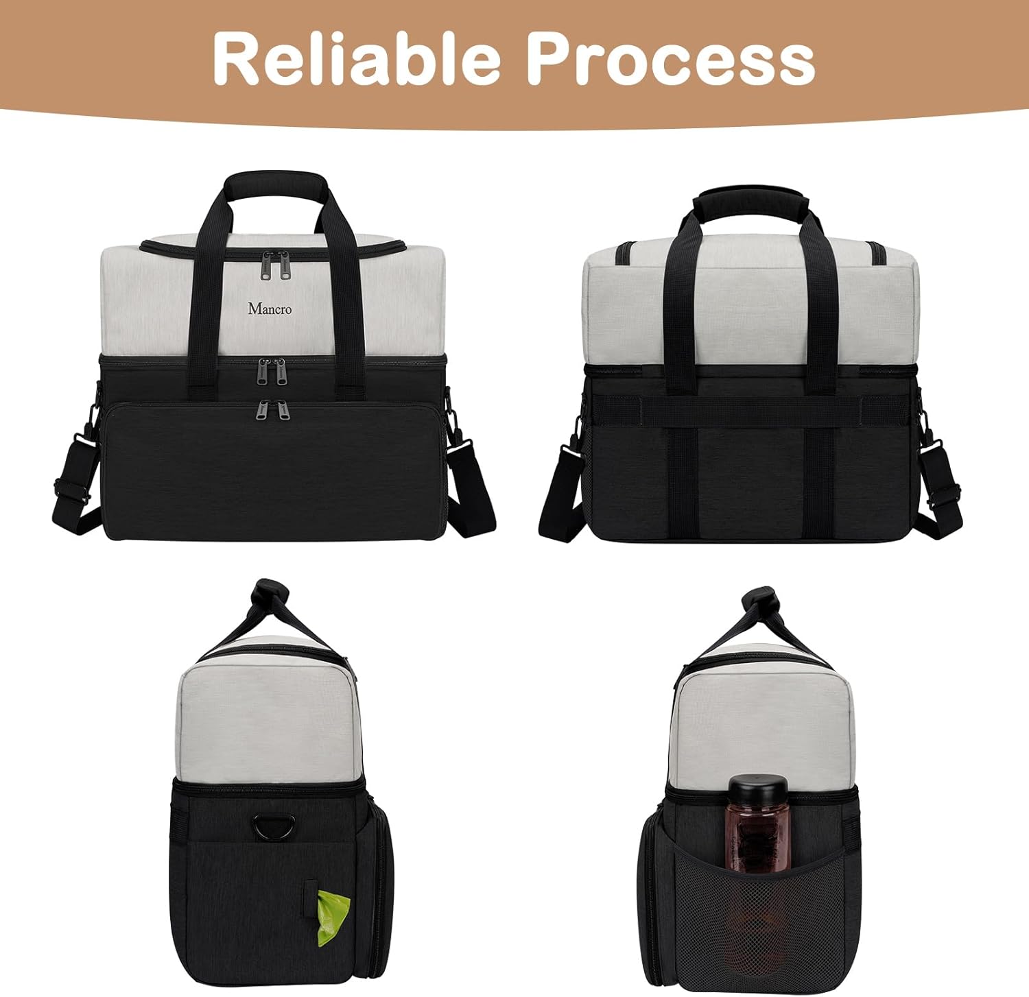 Dual Layers Design with Large Capacity: Mancro dog travel bag designed with double-layer design provides a more flexible and orderly space for the dog camping essentials. The top layer compartment is enough to accommodate all dog’s daily stuff, toys, dog leash, water bottles, dog food cans, towels, etc in one place. The down layer compartment can accommodate 2 large food containers separately, or you can put dog accessories in, such as clothes, blankets
