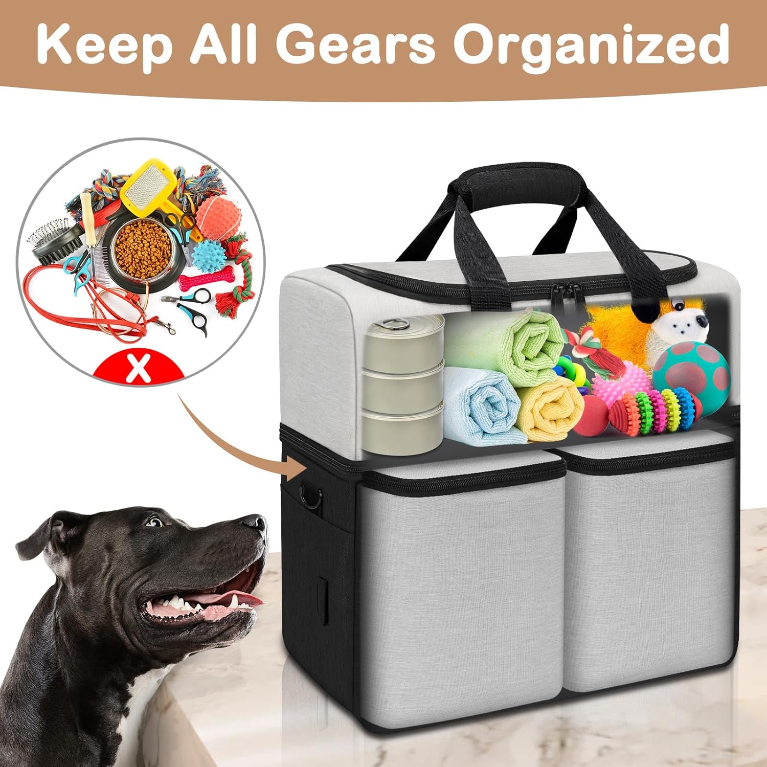 Keep All Gears Organized: The dog camping gear with large space to make it convenient to put all dog gear in and keep well organized for your traveling. Whether you are taking your dog on camping, hiking, road trip, or dropping them off at a dog-sitter, you can carry all supplies easily in one travel bags for dogs go