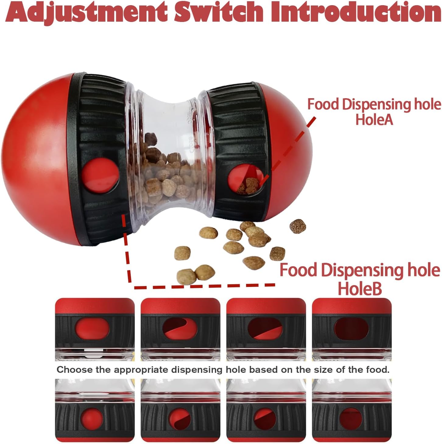 [Adjustable Switch] Each of the two spheres with a food dispensing switch, making it suitable for various sizes and types of pet dry food or snack. The switch can be adjusted according to the different sizes of dog food. It also allows control over the amount of food dispensed, extending or shortening the time it takes for pets to obtain food. It is more conducive to a healthy dog diet.