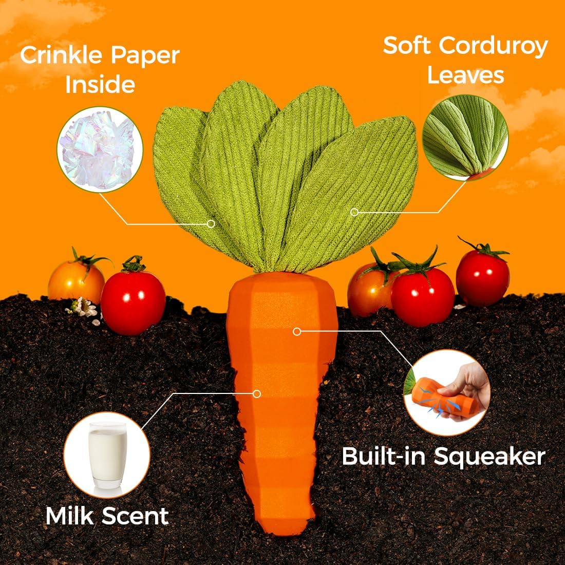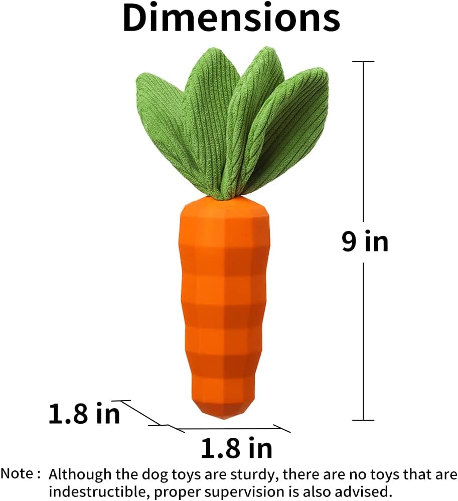 Green Leaves made of no stuffing plush with crinkle paper inside. Orange Carrot Body made of natural rubber. Toy dimensions is 9 in * 1.8 in.