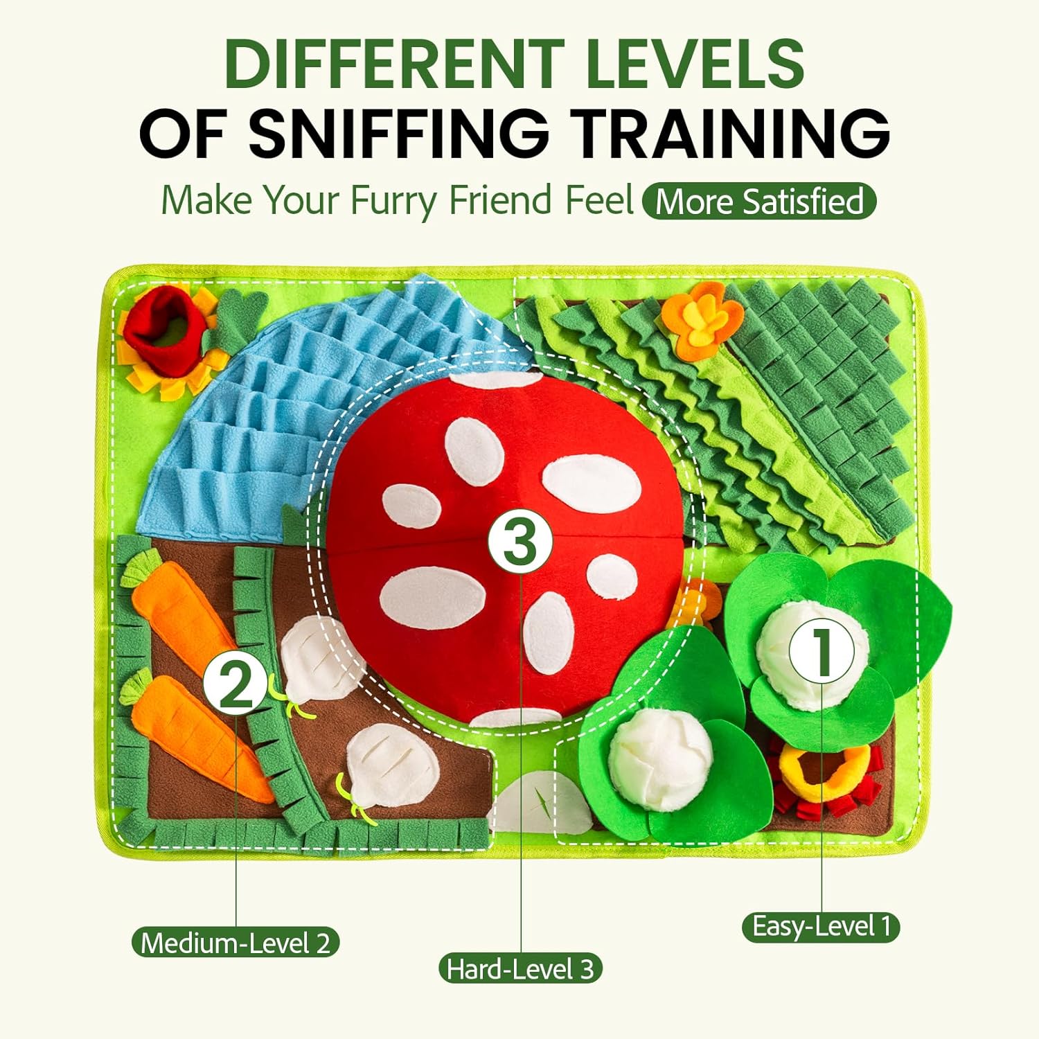 Cognitive Training: The dog snuffle mat features foraging areas of varying difficulty, with a cabbage that includes a crinkly sound. By encouraging natural food-seeking behavior, it stimulates your dog’s intelligence, boosts confidence, and reduces destructive tendencies
