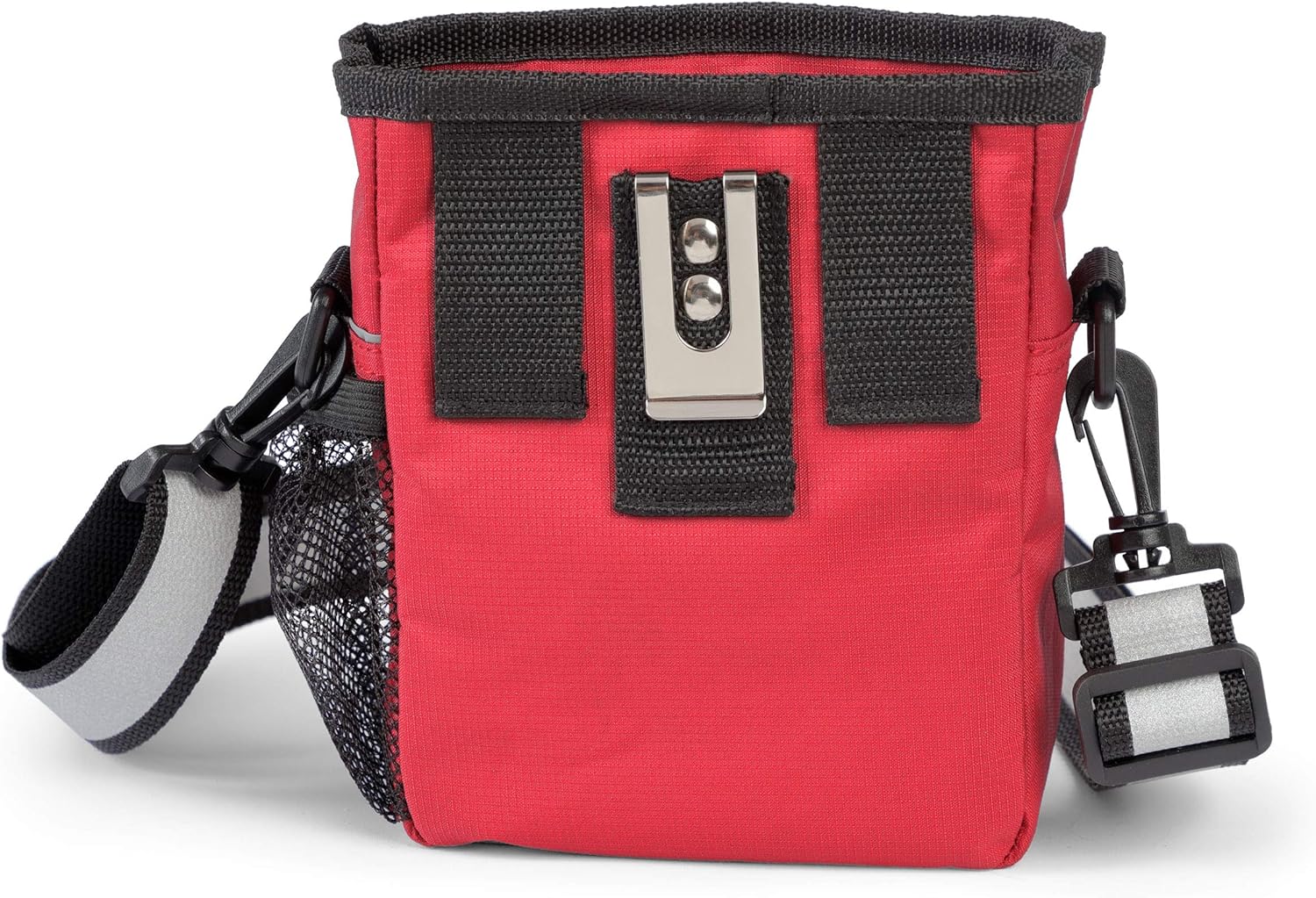 Also included is a pocket size flashlight, 2 reflective wrist straps for added visibility during night walks, and a roll of dog waste bags. The adjustable carry strap offers stylish flexibility and can be worn cross-body, over the shoulder, on the waist or with a belt hook. Dimensions: 6″ L x 7″ H x 2″ W