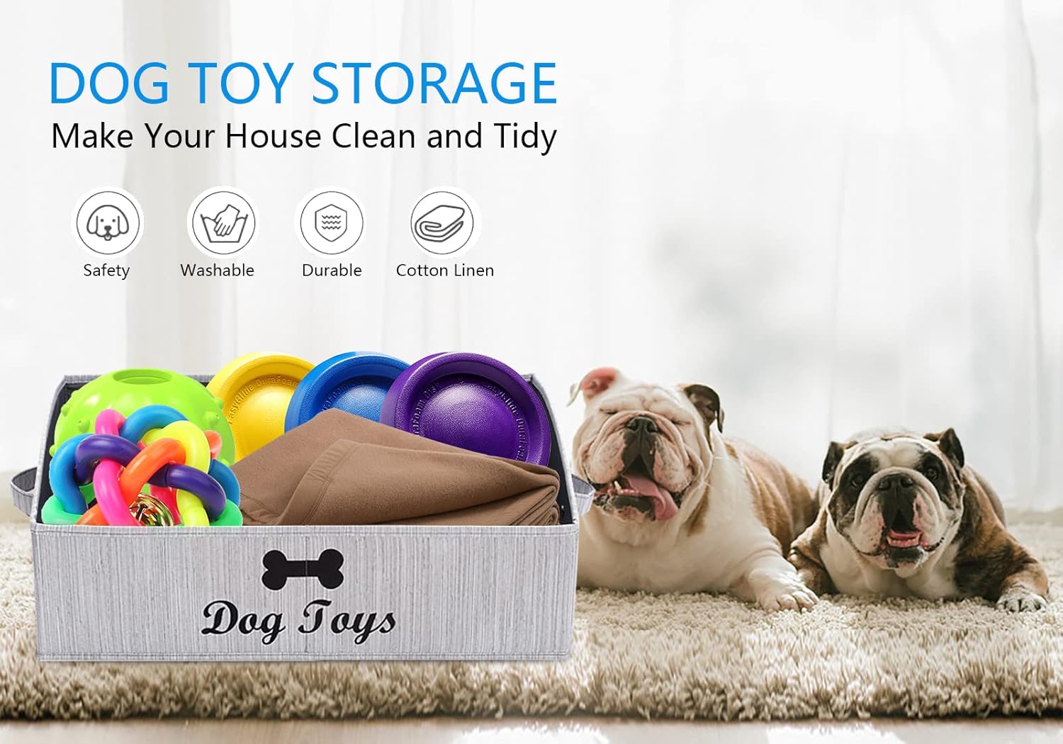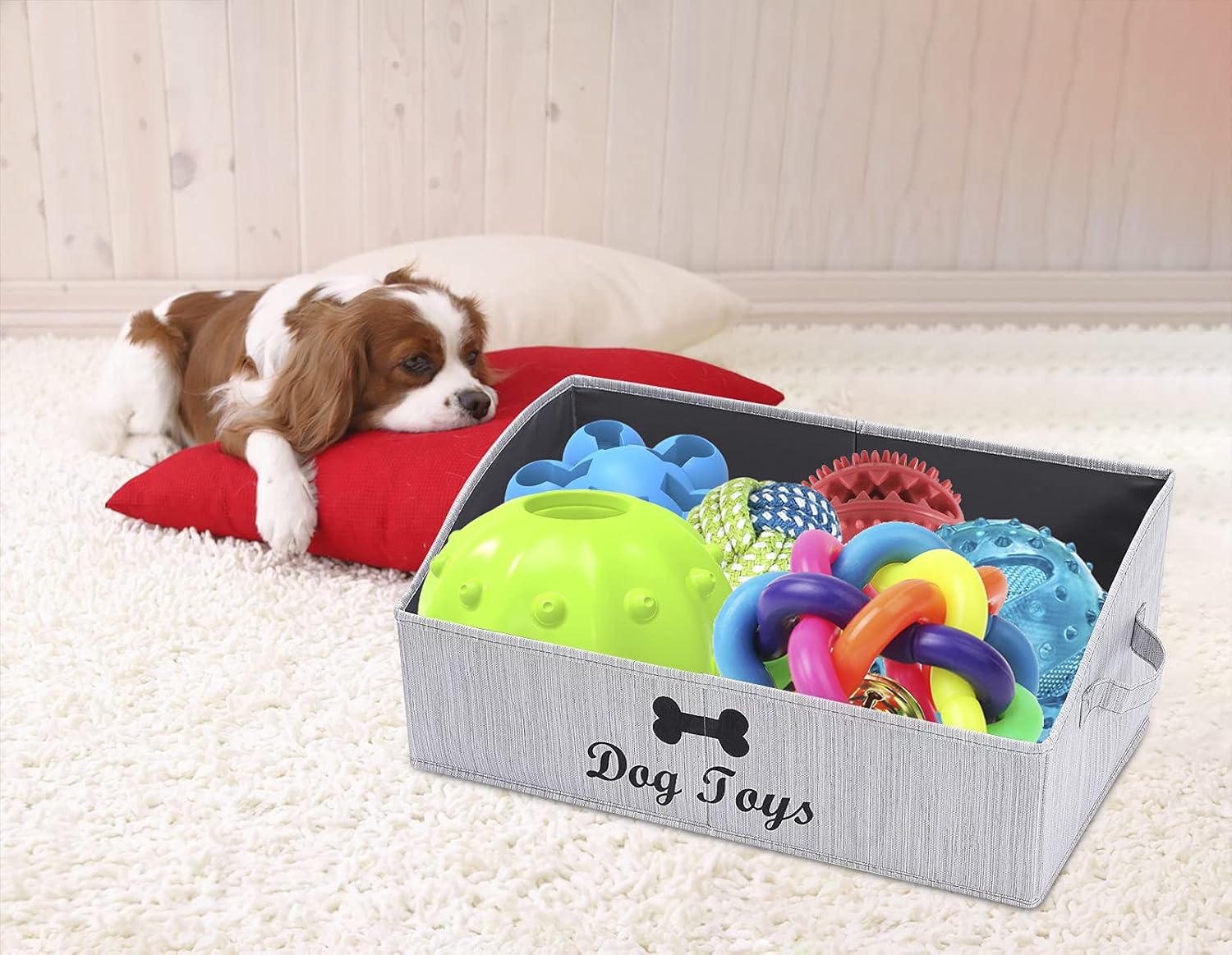 3: Dog toy basket large – Made from canvas, no sharp edges. The handles in two sides make it easy to transport or move when needed. Carry it anywhere from pet playroom, living room, family room, bathroom, closet, storage room, etc. Even works perfectly in car, travel trailer, touring RV.