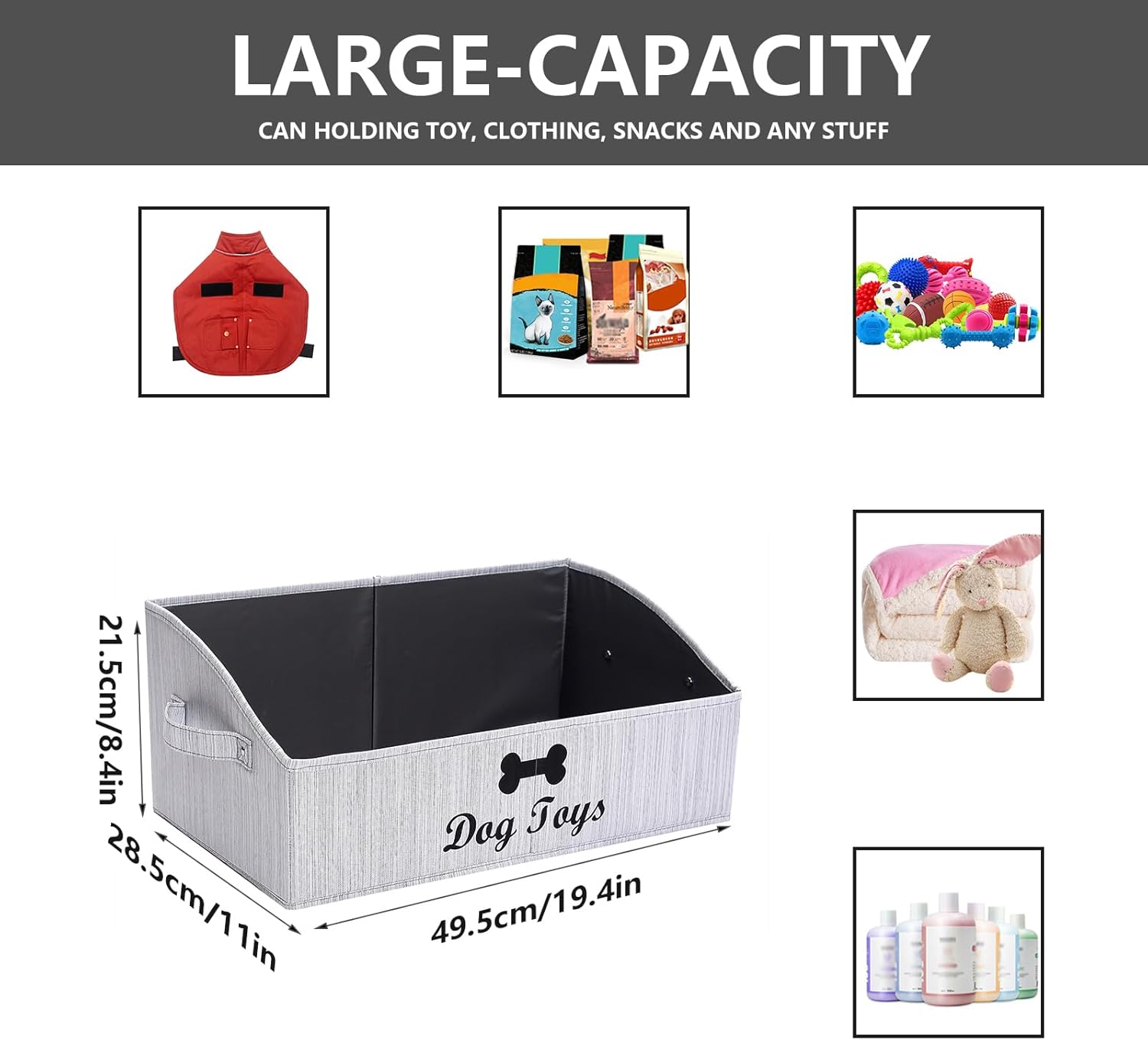 2: Dog storage organizer – 20″ Lx11″ Wx8″ H (50cm L x 28cm W x 21cm H) – Big enough! It will be able to fit plenty of your pet’s favorite toys and definitely help with the clutter is a definite buy for your dog items.