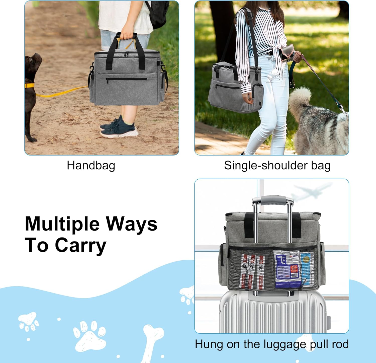 LARGE CAPACITY and FUNCTIONAL: This pet travel tote bag has a large inner compartment to to carry your pet accessories when traveling, like food, water, diaper, clothes, blanket, toys, leashes, frisbee, first-aid kit, etc..Comes with multiple functional pockets and built-in adjustable flap to stay flexible and organized.