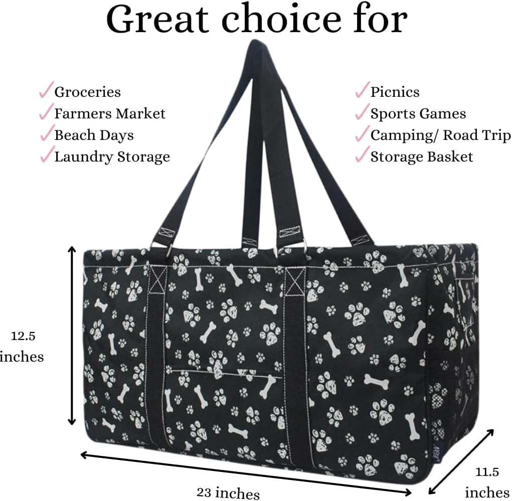 NGIL Extra Large Utility Tote Reusable Grocery Bag Oversized Collapsible for Groceries, Storage, Picnic, Beach (Printed Paws-Black)
