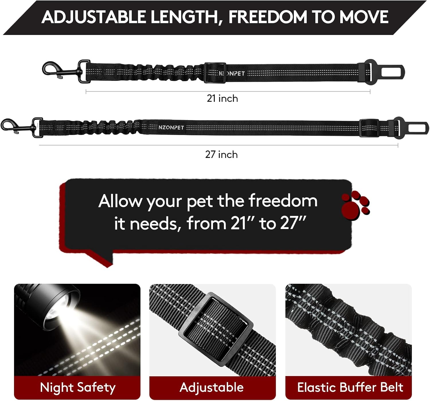 ELASTIC BUNGEE BUFFER DESIGN: Unlike a normal leash, Nzonpet car harness dog safety seat belt with elastic bungee buffer can prevent dogs from being injured during braking or sharp turns or bumps on the way. Gives you peace of mind, and keeps jumpy pets in place. Acknowledging that it’s the most important thing to have your pet secure than not.