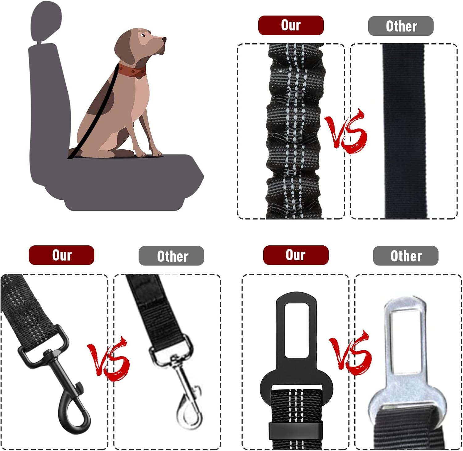 STURDY&DURABLE: NZONPET heavy duty dog seat belt for car is made of high density nylon fabric to ensure durability. The 360° zinc alloy swivel snap and universal fit buckles are sturdy enough to ensure the safety of your dog while traveling. This is the dog seatbelt leash that lasts!