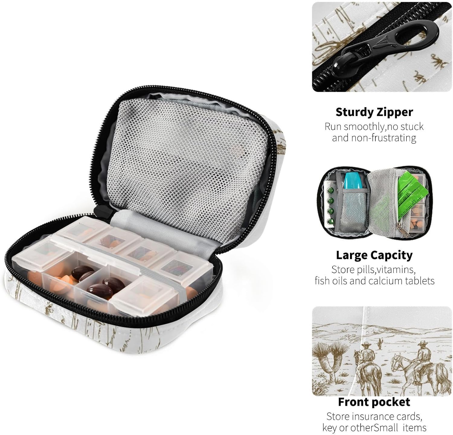 Ollabaky American Wild West Desert Cowboys Cactus Pill Organizer Travel Pill Cases Bag Portable Pill Container 7 Days Pill Box Organizer Vitamin Supplement Holder with Zipper for Family