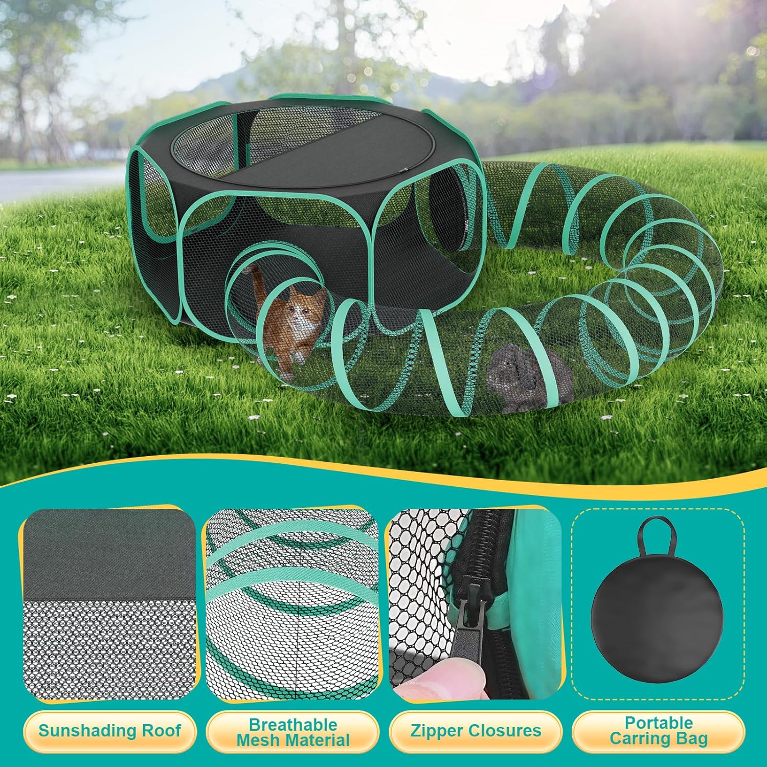 Outdoor Cat Enclosures: Includes one cat tent, one looping tunnel, provide one free straight tunnel. The cat tunnel can link to cat tent by zipper for cats to play. Cat tent and cat tunnels can be used together or separately to create a complete cat playhouse set. Let your pet enjoy the sunny outdoors in this versatile cat outdoor playpen, ensuring their playtime is both joyful and safe.