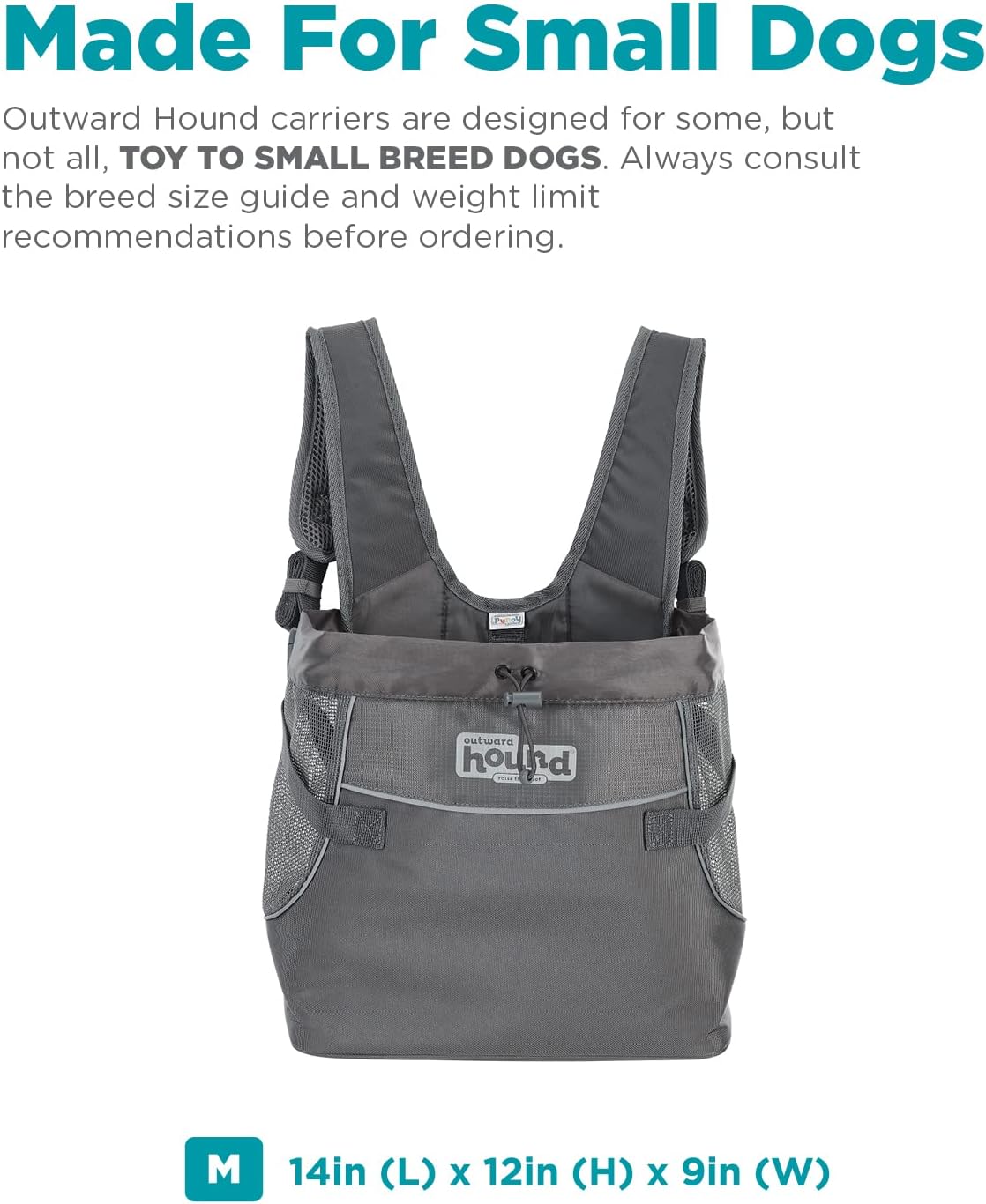 Taking your pup on your next adventure is easier with the Outward Hound PupPak Front Carrier. This hands-free front pack makes carrying your dog safe, comfortable & easy when you’re on the go! Water-resistant fabric combined with mesh siding provides a secure and ventilated space for your pup to enjoy the scenery as they travel snuggly against your chest. Padded shoulder straps and adjustable buckles keep you comfortable while an interior clip clips in your furry friend for safe travels. The top drawstring can be cinched for a more secure fit. Sizing: Small: For dogs up to 10 LBS, MAX 7 in. long and 12 in. tall Medium: For dogs up to 20 LBS, MAX 10 in. long and 15 in. tall Hand wash with warm water and mild soap. Air dry. WARNING: For pets only. This is not a toy. Keep out of reach of children. Train your pet to be comfortable in the PupPak before use. Attach safety tether to your pets harness, do not attach to your pets collar. Do not allow your pet to chew on the PupPak. Inspect regularly and immediately discontinue use if any part becomes lose or detached.