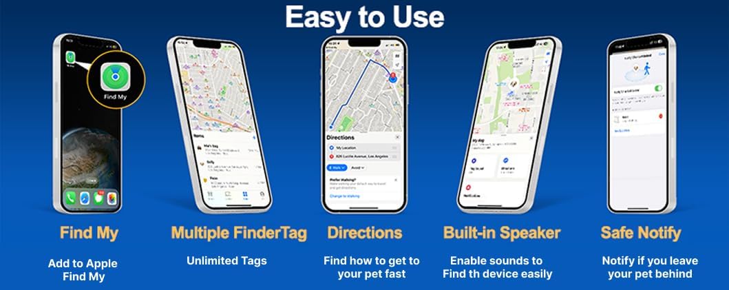 “GPS Tracking: Monitor your pet’s location and activity levels with the built-in GPS tracker and companion app. Easy to set up: A simple one-tap setup instantly connects the pet tracking collar tracker finder to the Find My app on your Apple devices to follow in real-time on your phone. Lightweight & Waterproof: It is made of high-quality nylon, silicone, and ABS. It is solid, resistant, and waterproof. Adjustable Size: It is easy to get a perfect fit around the pet’s neck. It is suitable for small, medium, and large dogs and cats. Long Battery Life: It is powered by a CR2032 button battery that has a super long standby time over 12 months and can be easily replaced for long-term use.”