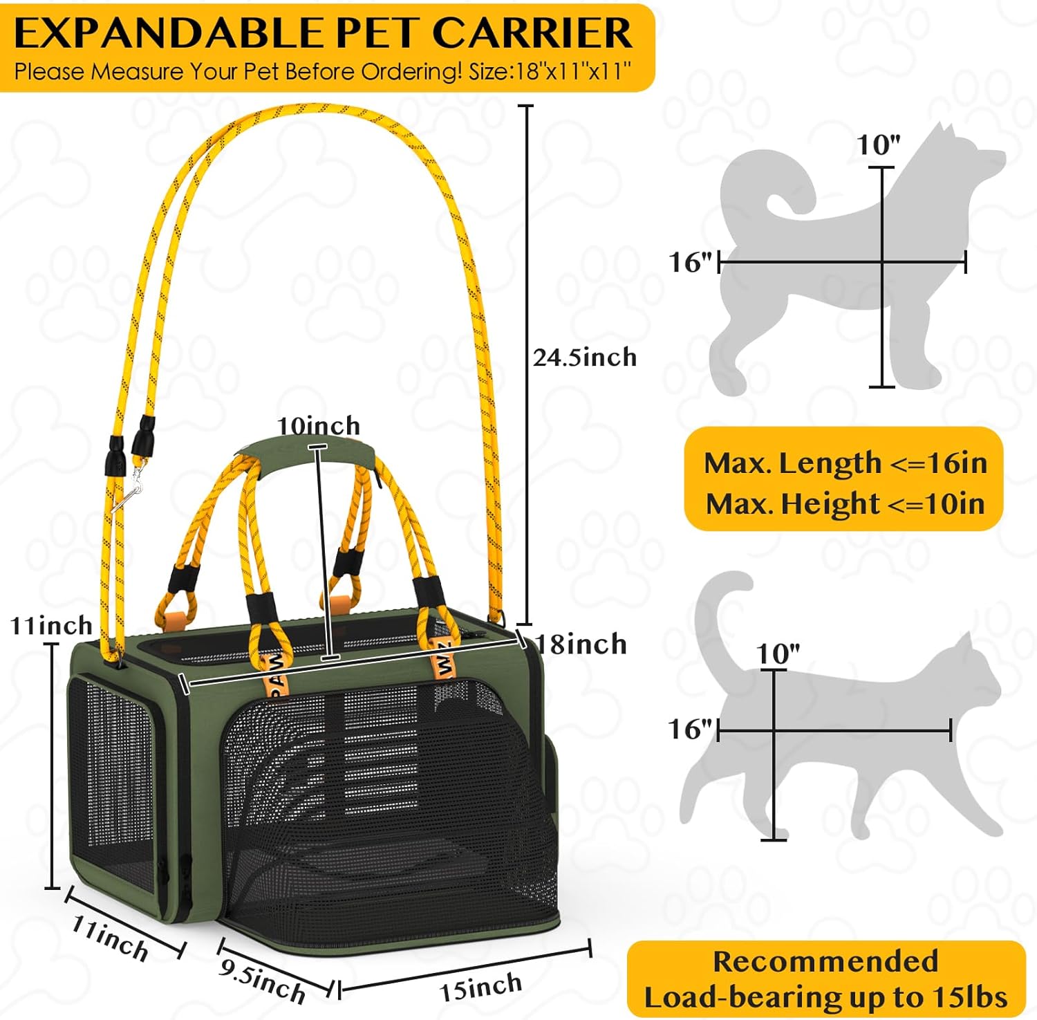 Double the Space, Double the Comfort: Expandable Pet Carrier design allows you to zip open the front side, providing your pet with double the room to stretch and relax. Ideal for two small or large cats, rabbits, small dogs, and other animals. Soft-sided cat carrier airline-approved underseat measures 18x11x11 inches! TIPS: If the 2-inch D-ring carabiner breaks, contact PAWZIDEA by email or customer service for a FREE replacement.