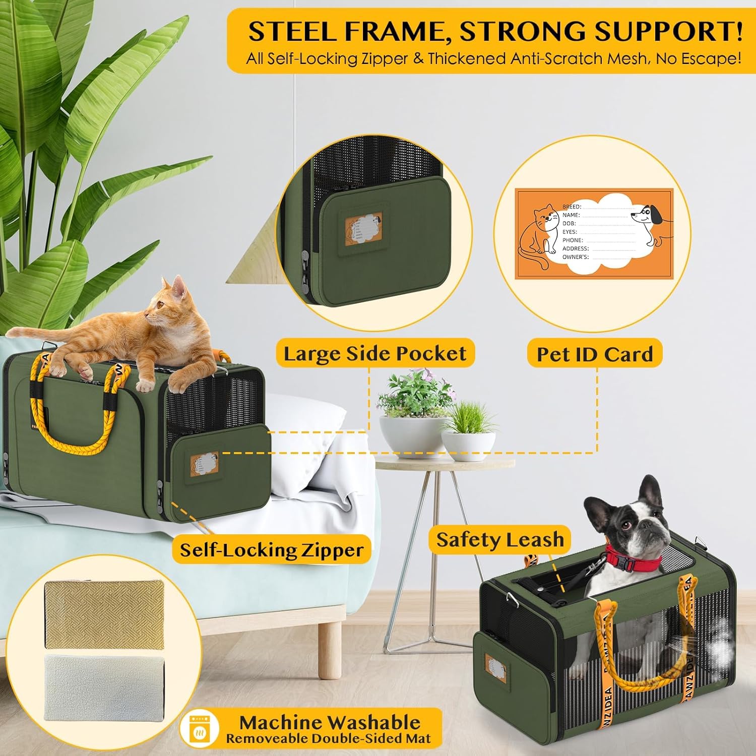 Convenient and Safe for Travel: TSA airline approved dog carrier bag with a large side pocket for storing pet essentials. Includes a customized ID card for your pet’s information, all self-locking zippers, and a safety leash clip to prevent escapes. The solid PP board bottom prevents urine leakage, and the removable double-sided pad is easy to clean. Holds up to 15 lbs of large cats and dogs.