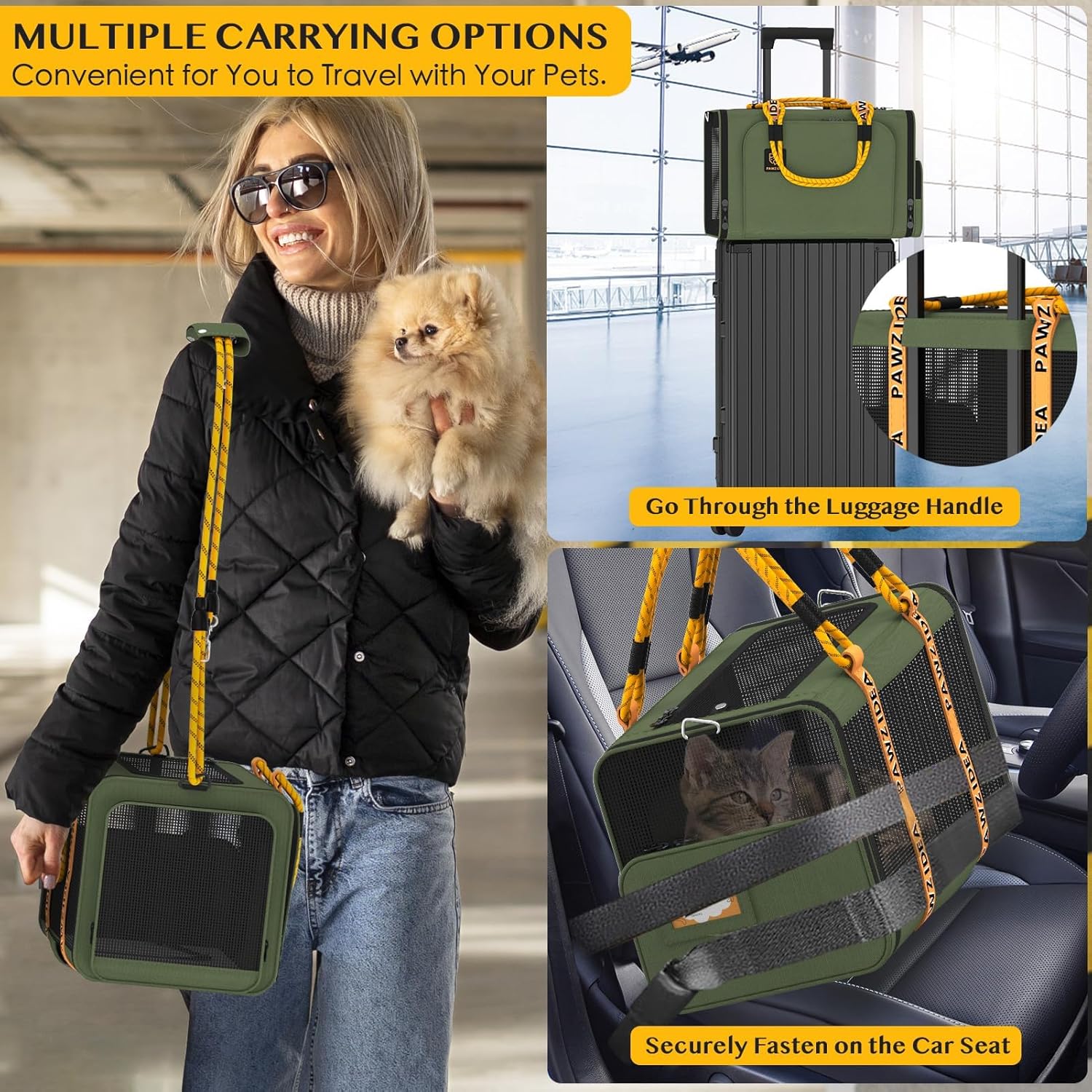 Multiple Carrying Options: Equipped with 2 velcro straps on the back that can be secured to a luggage handle for easy travel. Can also go through a car seat belt for secure car rides and vet visits. Features a soft handle with a detachable shoulder pad for comfortable carrying. The shoulder strap doubles as a dog leash, and the shoulder pad can be used as a dog poop bag dispenser!