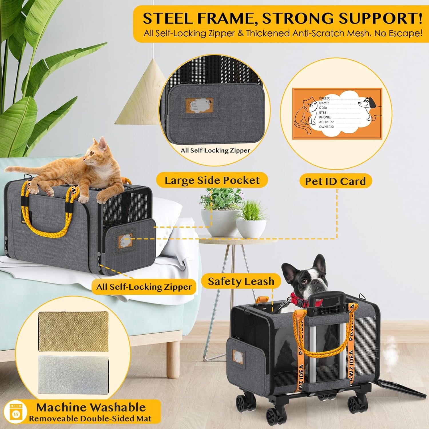 PAWZIDEA Pet Carrier with Wheels, 18x11x11 TSA Airline Approved Cat Carrier for 2 Cats Under Seat, Expandable Soft-Sided Dog Carrier for Small Dogs Rolling Travel Bag with Telescopic Handle, ID Card