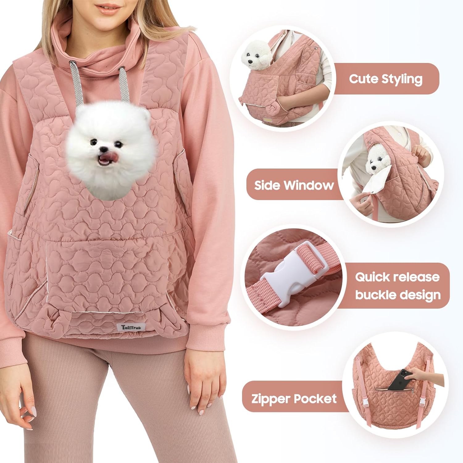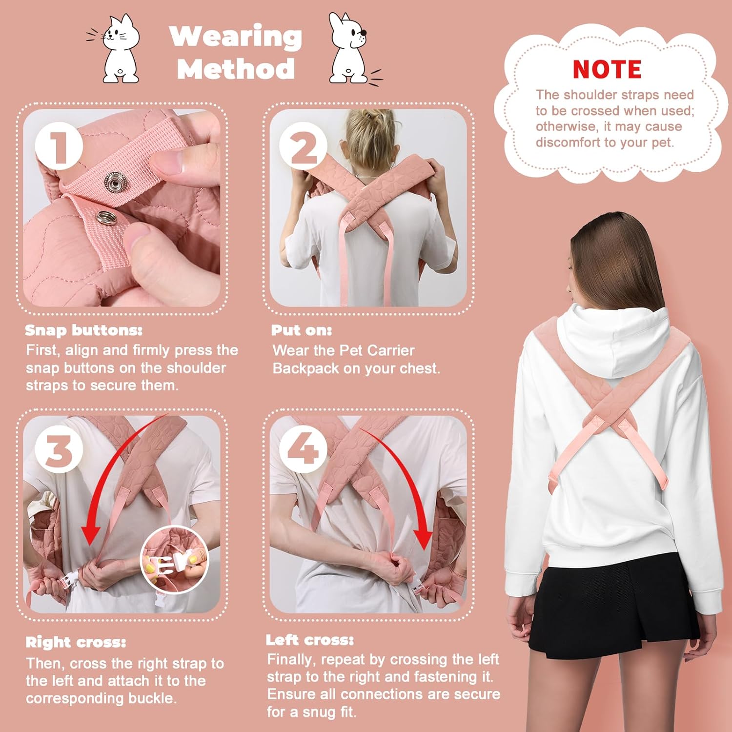 【Multiple Pocket Design】: Our Pet Carrier Backpack is equipped with multiple pockets, including two side pouches and front and rear zippered pockets, offering ample storage for essentials like snacks, waste bags, your wallet, phone, or keys. Everything you need is within easy reach. (𝐏𝐥𝐞𝐚𝐬𝐞 𝐧𝐨𝐭𝐞: If you find the straps too long, cross them when using to prevent slipping off your shoulders. For step-by-step instructions, please refer to Figure 4.)