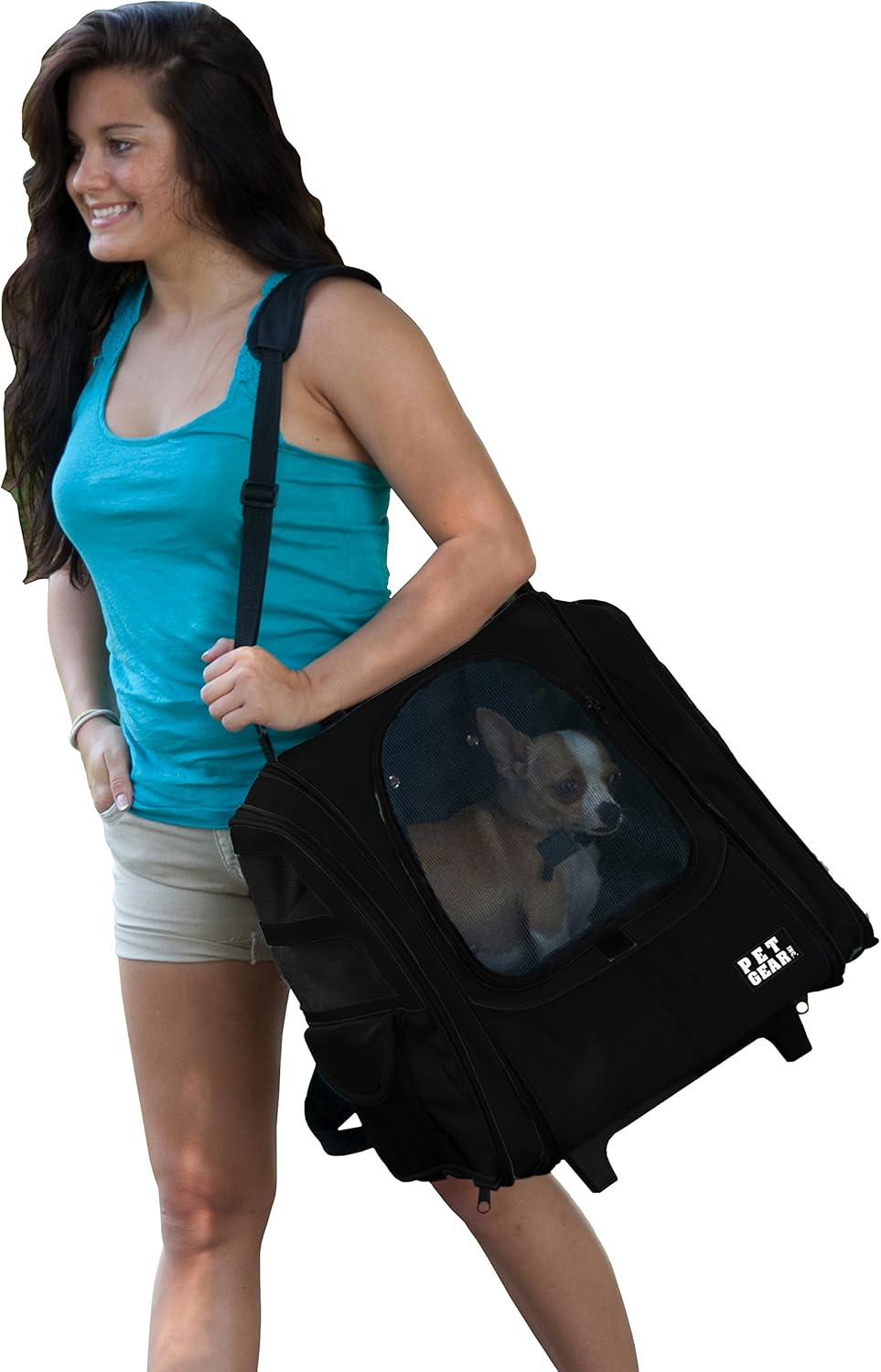 The I-GO2 Traveler is a five-in-one product. It has a telescoping handle with wheels, to function as a roller bag and can also be used as a backpack, tote, carrier, and car seat. This product comes fully assembled and includes a removable pad for easy cleaning, tether to secure pet, and wheel cover. This product was designed with small pets in mind. Please refer to our sizing guide to make sure you have chosen the right model for your pet.