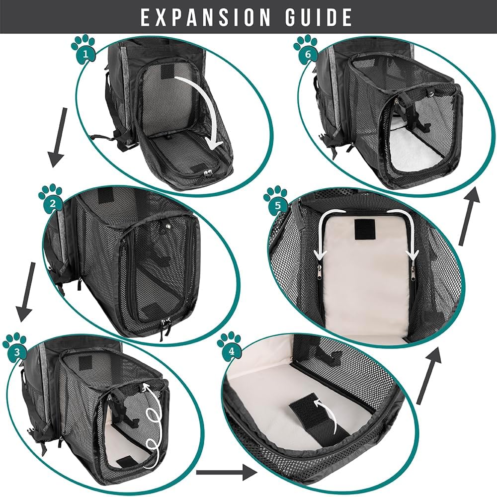 EXPANDABLE PET BACKPACK CARRIER: This airline approved carrier backpack is perfect for small or medium sized dogs and large cats. Designed for the maximum convenience and comfort while hiking and traveling.