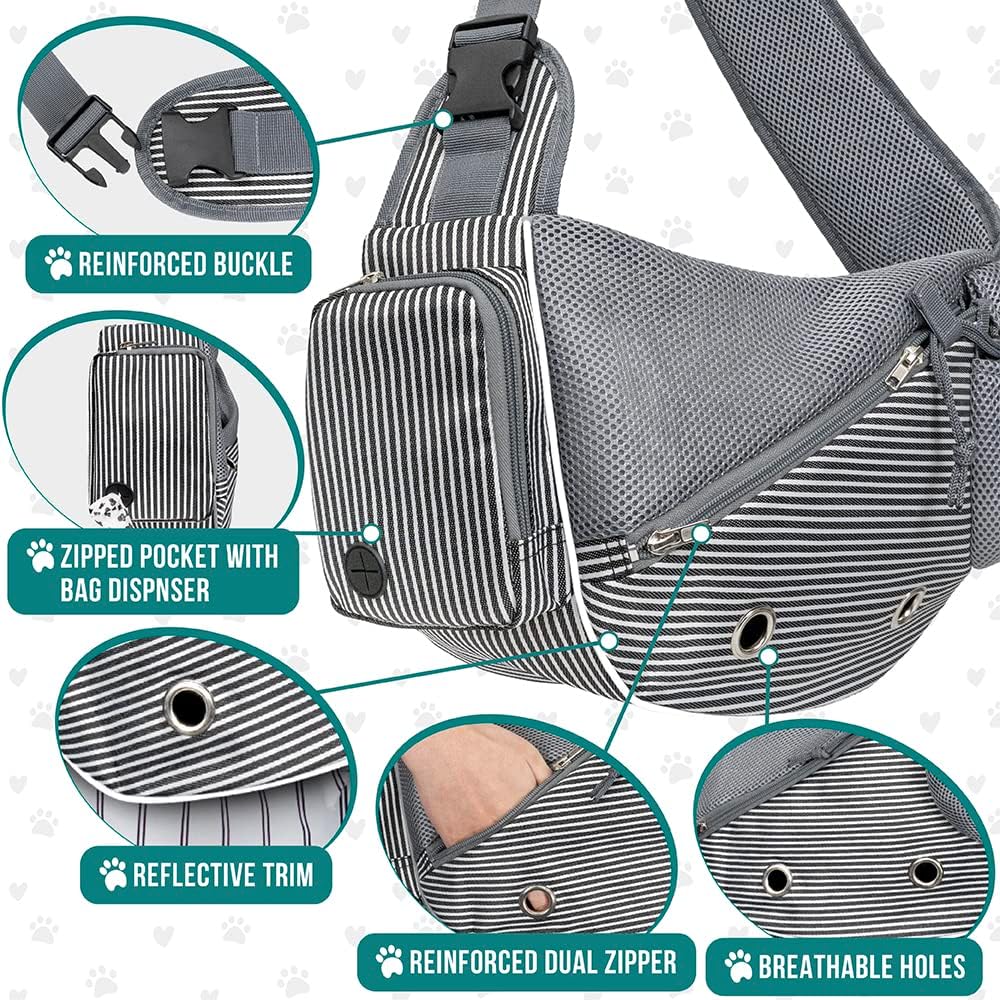 PetAmi Dog Sling Carrier for Small Dogs, Puppy Carrier Sling Purse, Dog Bags For Traveling, Carrying Bag to Wear Medium Cat, Adjustable Crossbody Pet Travel Poop Bag Dispenser, Max 10lbs, Stripe Black