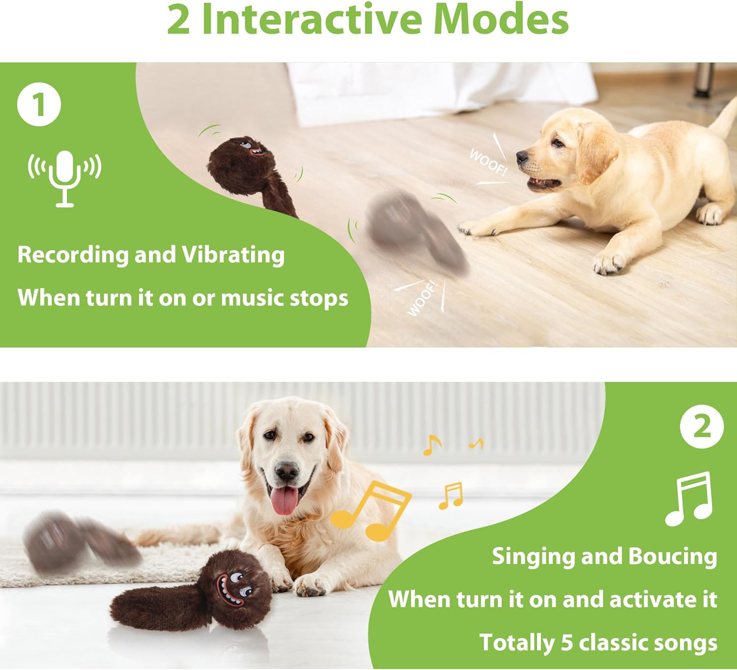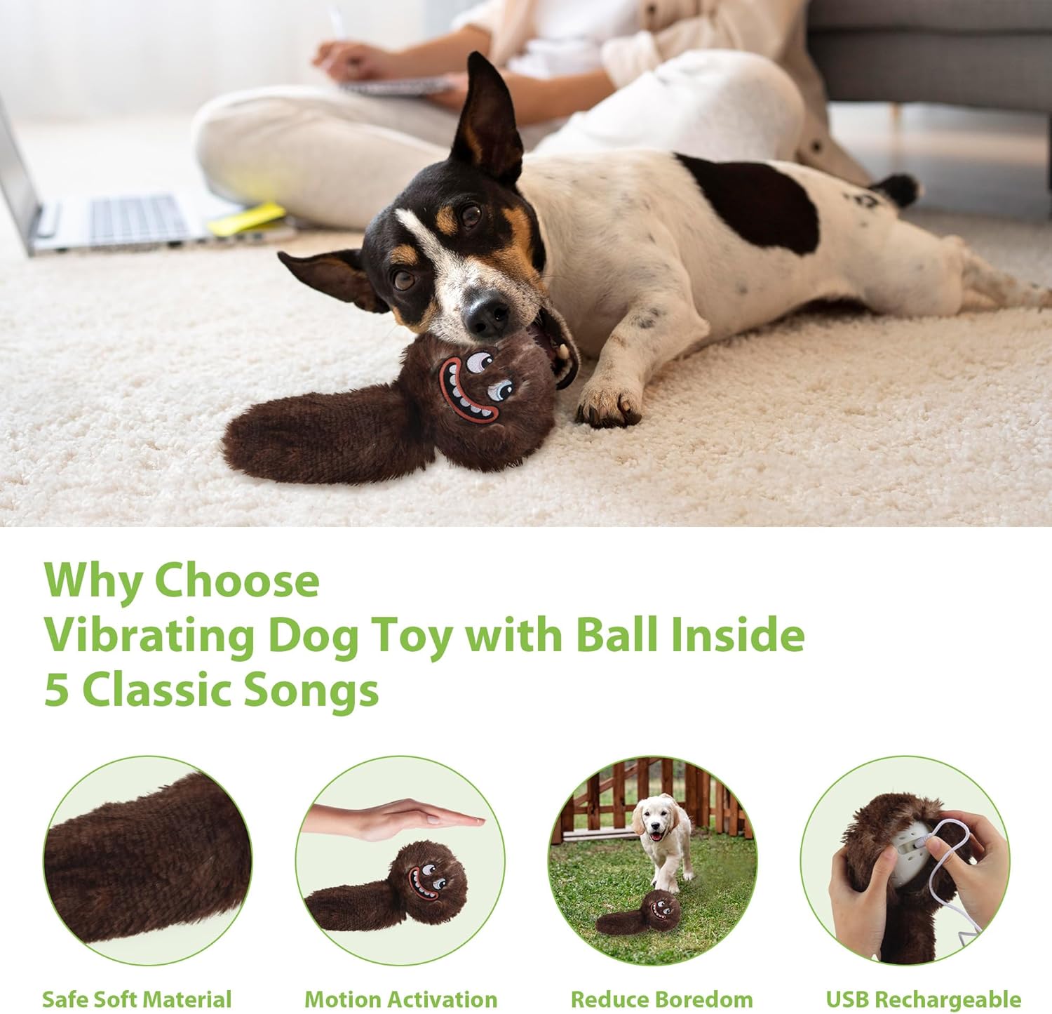 EASY TO USE & RECHARGEABLE: Simply open the nylon buckle and turn it on to enter recording mode, where it’s ready to vibrate, bounce, and capture sounds. After your dog pats and activates it, the vibrating dog toy will sing while shaking, then alternate between singing and recording for endless fun. When playtime ends, just switch it off. This dog enrichment toy is powered by a 3.7V, 350mAh Lithium-Ion battery, ensuring long-lasting playtime