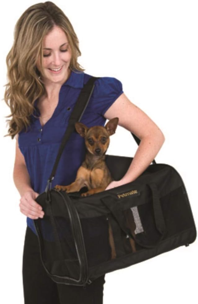 The Petmate Soft-Sided Kennel Cab provides a comfortable and breathable carrier for pets. The two easy-open zipper doors allow quick and easy access and provide plenty of space to place pets inside. The lightweight Petmate soft kennel has a carrying handle and adjustable shoulder strap for comfortable transport. The mesh walls of the soft sided pet carrier give pets fresh air and superior visibility. The Petmate soft sided kennel cab has PVC backing and plastic feet to provide stability and reduce wear to the kennel bottom. The exterior rear pocket and clear sleeve provide extra storage to save space during travel. The removable pad has a plastic-lined bottom for quick and easy cleaning. Three stylish color combinations are available, including “black,” “pink/zebra,” and “taupe/mink.” To accommodate a wide range of pets, the Petmate soft-sided kennel comes in 2 sizes: 20×11.5×12 and 17x10x10. The Petmate soft sided pet carrier meets most airline cargo specifications for easy and safe travel, but pet owners should always check with individual airlines.
