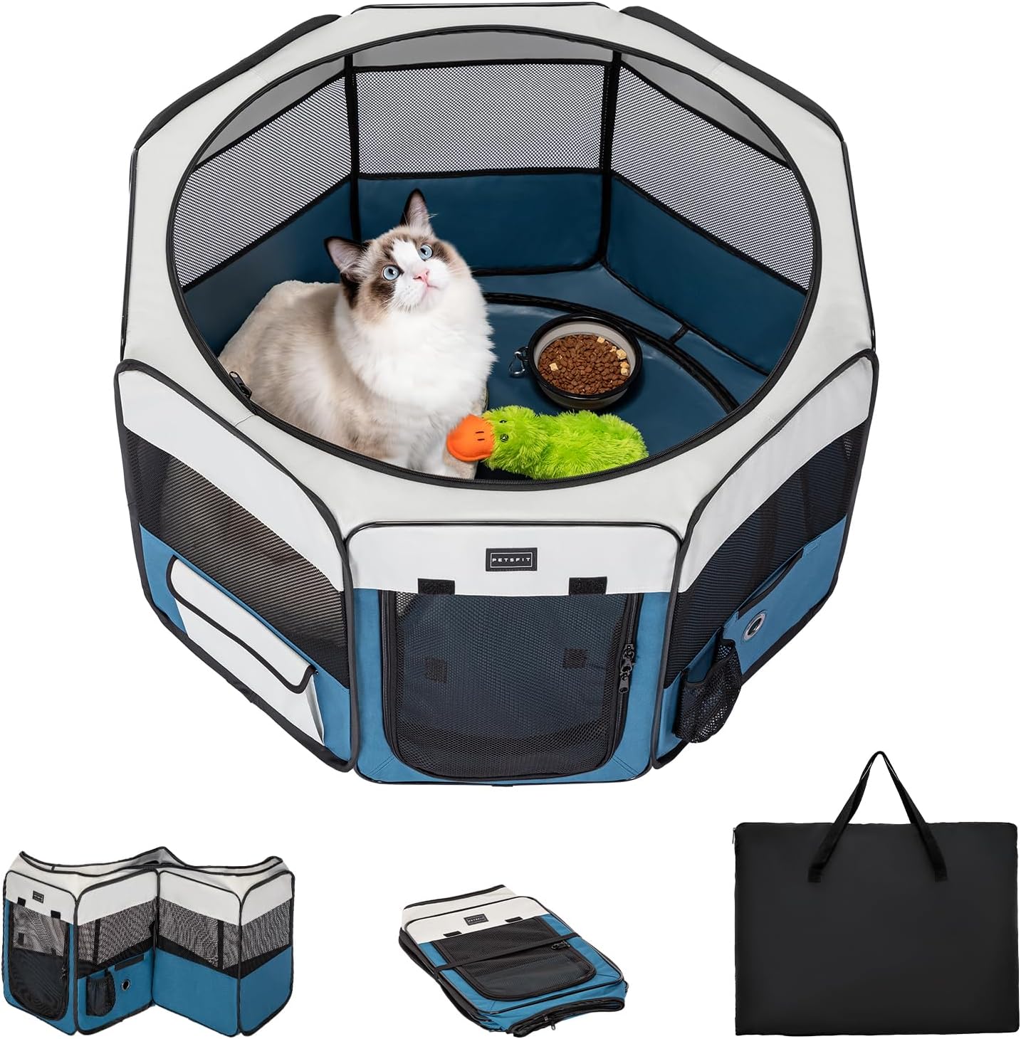 3-Second Setup & Travel-Ready:This lightweight pet playpen comes with a carrying bag for easy transport, sets up quickly and folds flat, includes two pockets and a water bottle holder, ideal for travel and camping with no assembly required