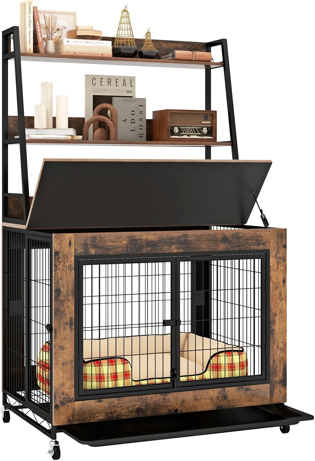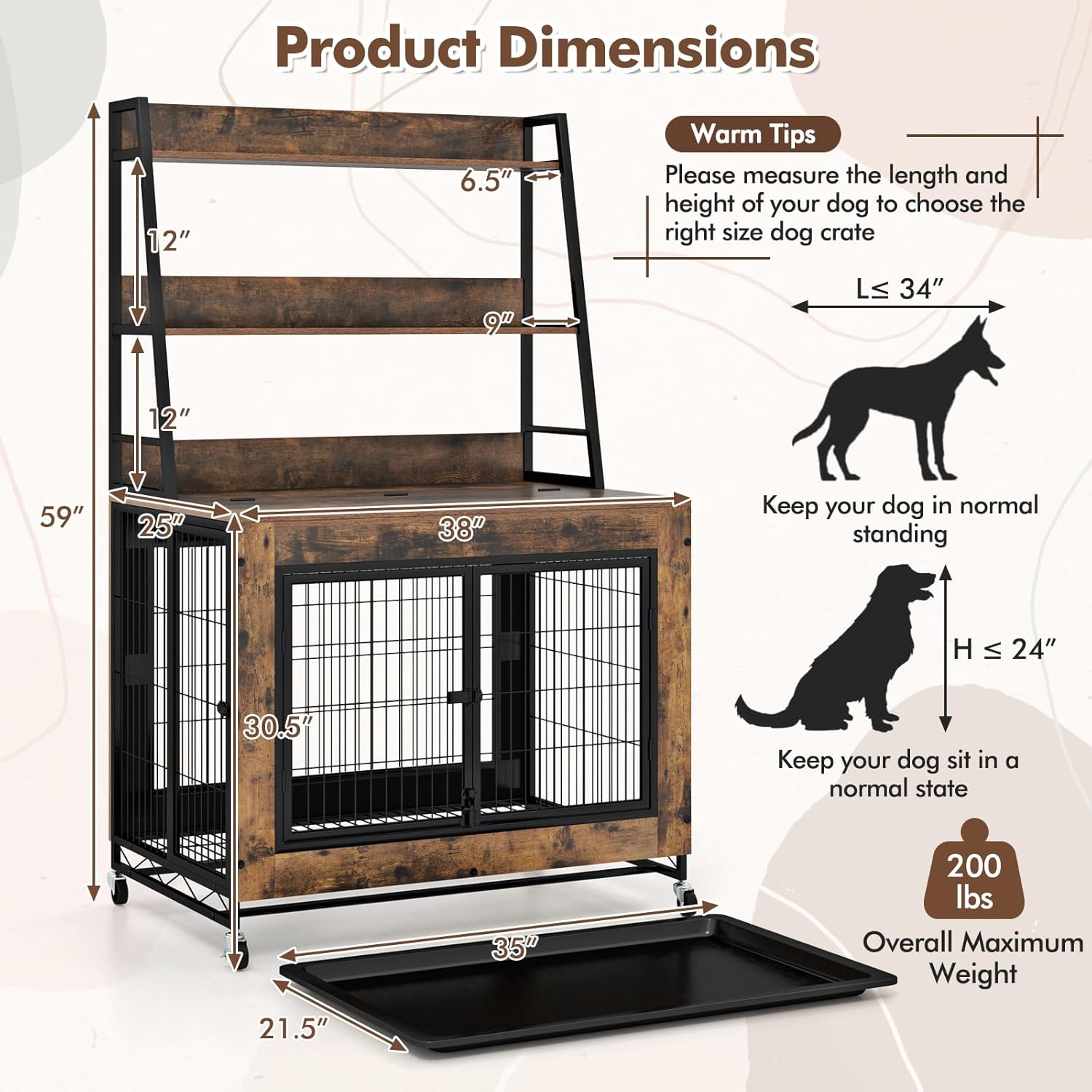 2-in-1 Crate with Storage: With a spacious 38″ x 25″ tabletop and 2-tier storage shelves, the dog kennel not only serves as a secure sanctuary for your pet but also offers ample storage for dog treats, books, and potted plants. The industrial design ensures durability without compromising on aesthetics.