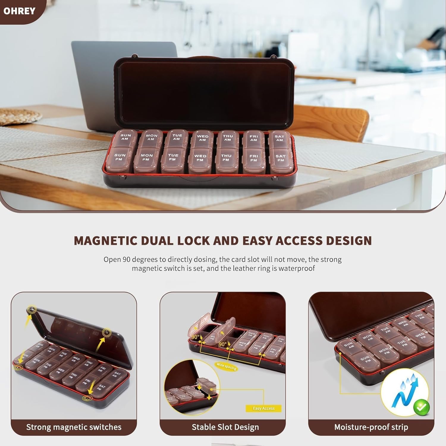 Pill Organizer 2 Times a Day, Weekly Travel Case for Vitamins, Fish Oils + 2 Detachable Cute Boxes (Brown)