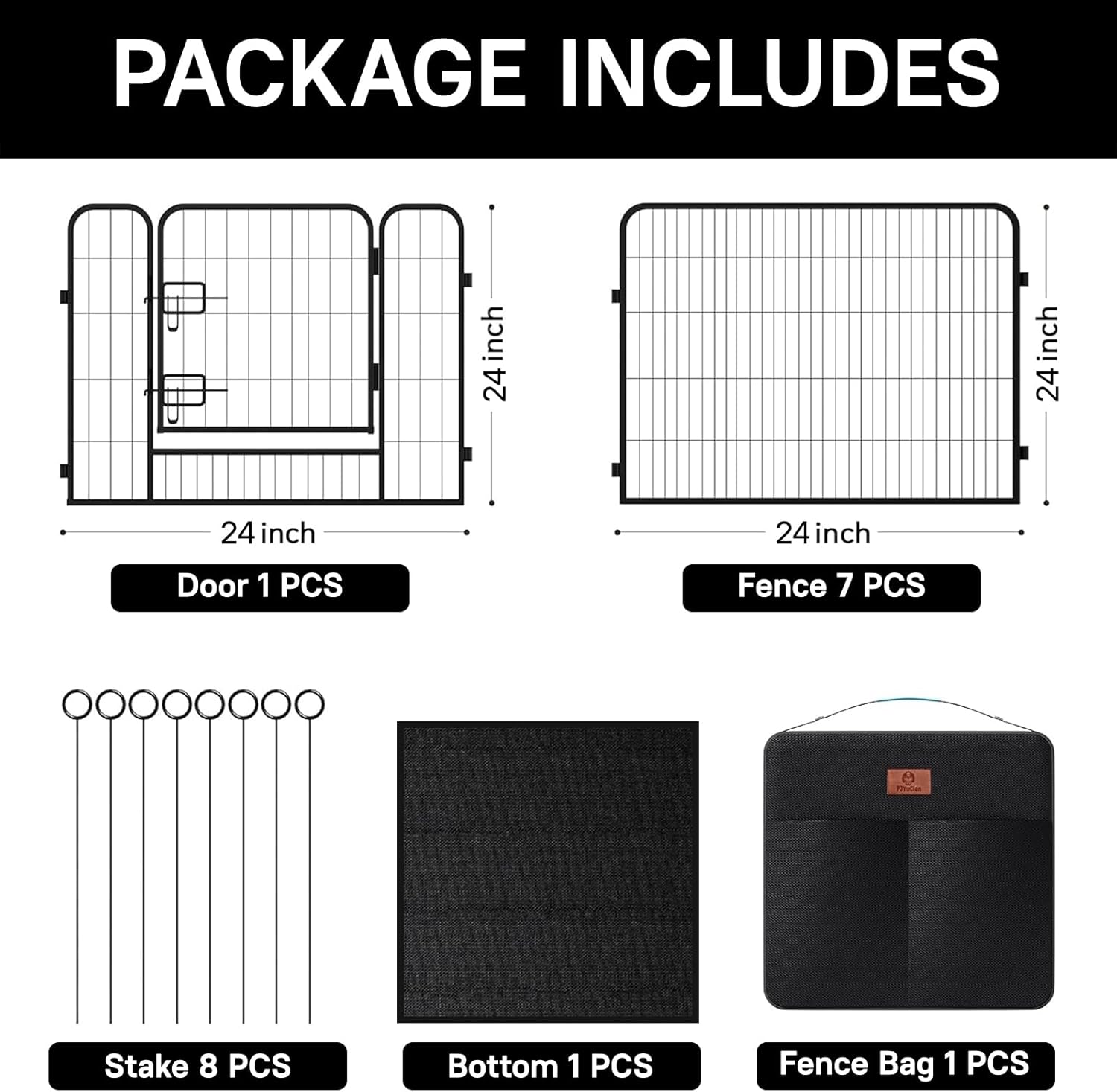 【Double Packaging】Your dog pen arrives double-wrapped in a cardboard box and Oxford storage bag to minimize shipping damage. Contents include: 1 door panel, 7 regular panels, 8 stakes, 1 bottom pad, and 1 storage bag. Contact us immediately if any parts are missing—we’ll provide a solution within 24 hours.