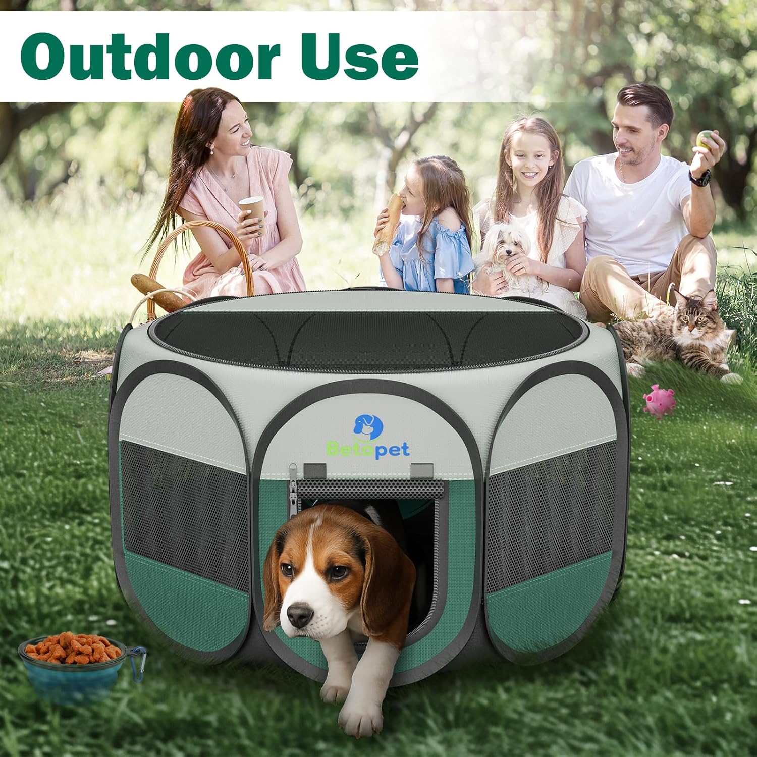 Crafted with high-grade 600D polyester Oxford fabric and thick reinforced mesh panels, this playpen ensures long-lasting durability and waterproof protection. Critical seams and corners are reinforced to withstand pet claws and chewing. Features 8 breathable mesh walls + a half-mesh roof for 360° airflow and visibility, allowing pets to observe their surroundings while staying safely enclosed.