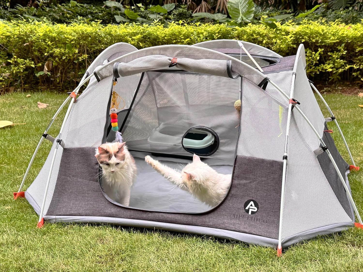 Innovative Design: Large size measuring 55″x55″x26″, this cat play enclosure features a breathable, anti-mosquito mesh design with top and side zipper closures. It includes built-in toy hooks and comes with a removable jumping cloth, providing ample fun and stimulation for your cats while they explore the outdoors.