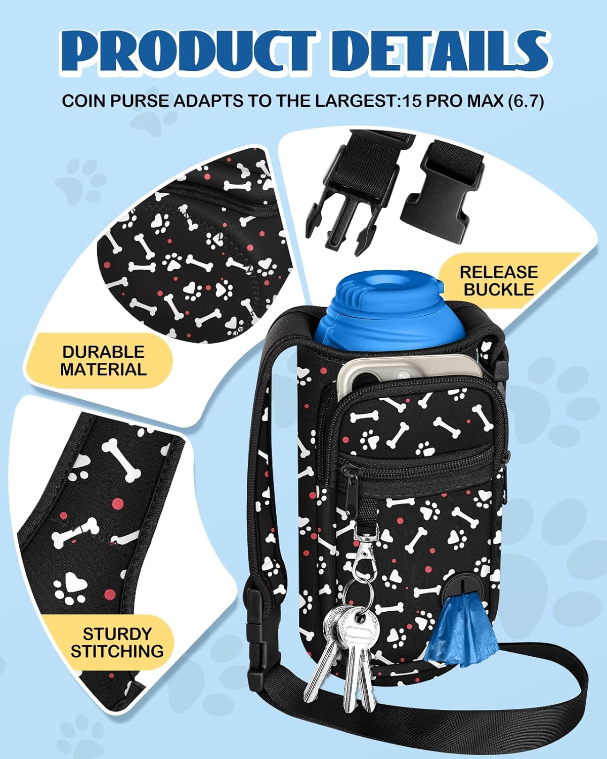 Multi-functional pocket: The water bottle bag features 2 front zippered pockets, suitable for storing essentials such as phones, bank cards, cash, headphones, keys and pet waste bags are conveniently pulled out