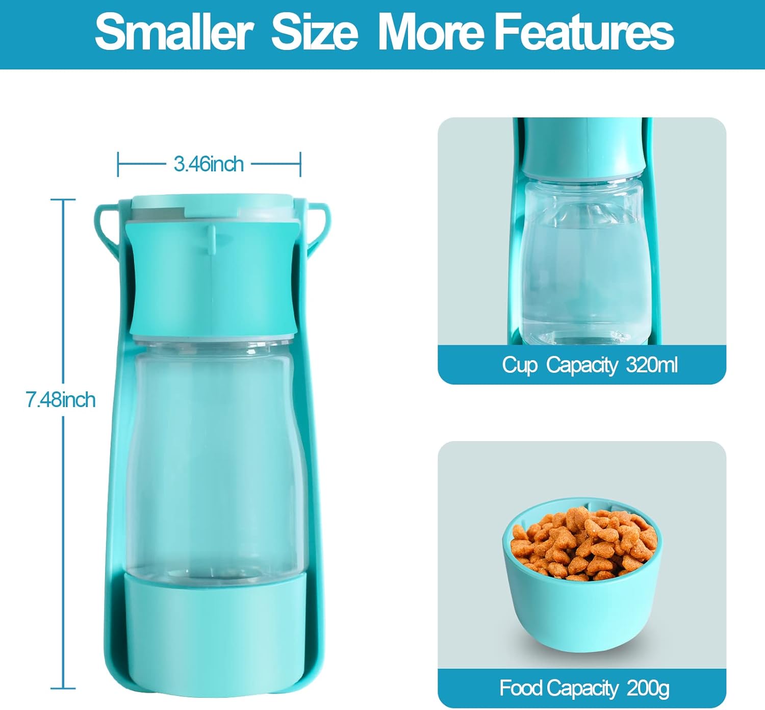 MULTI-FUNCTIONAL DESIGN:portable dog water bottle holds 11oz water and 200g food Suitable for Puppy short trips.