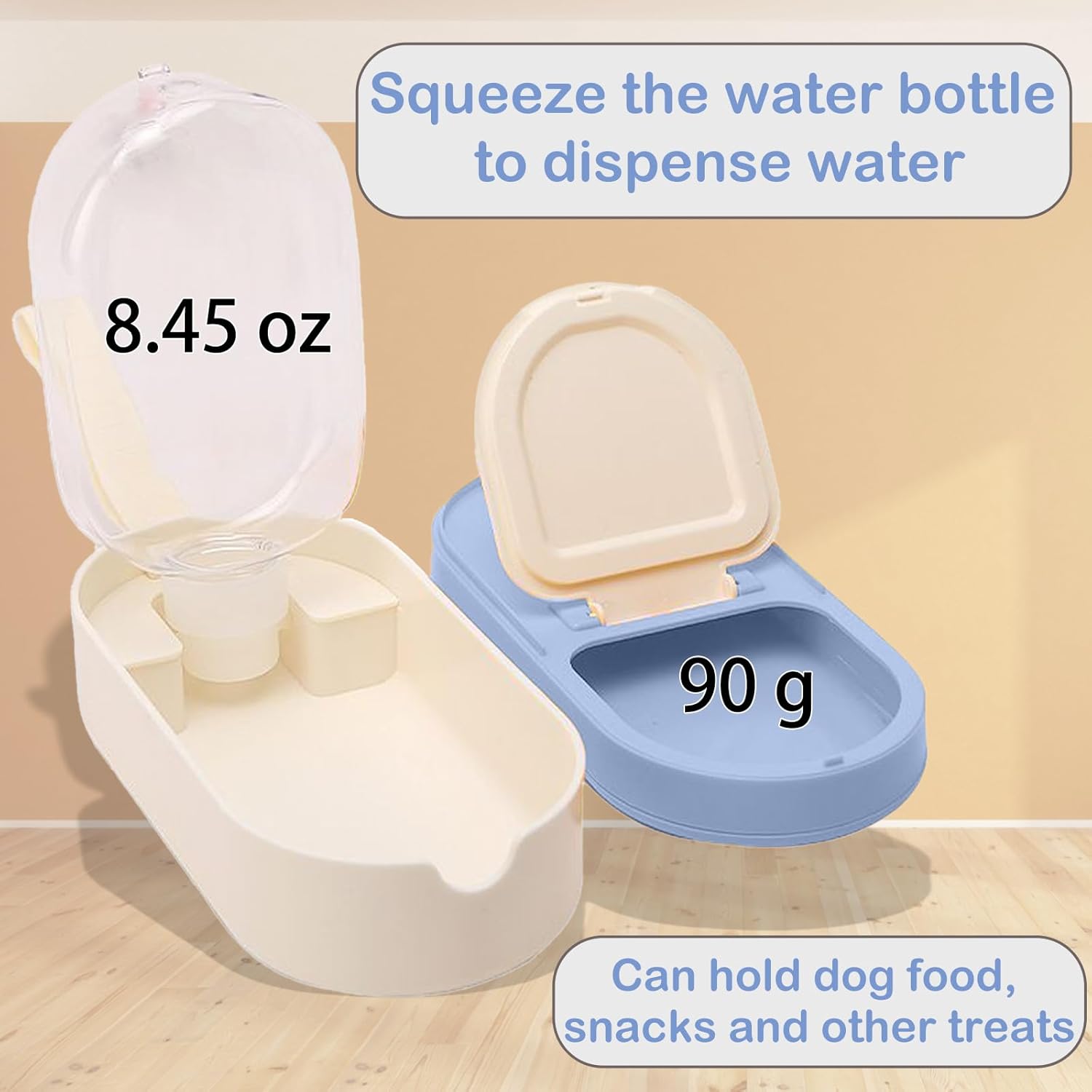 WATER AND FOOD IN ONE: Built-in water bottle, water comes out with a pinch, the mouth of the bottle locks the water without leaking, the food storage compartment can be used for food or small snacks.