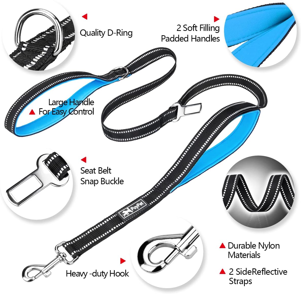 PoyPet 5 Feet Dog Leash – 3M Reflective – 2 Cushioned Handles – Functional Car Seat Belt(Blue)