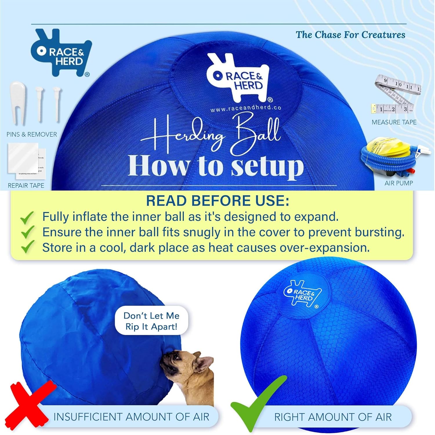 Avoid leaving the ball in the sun to prevent expansion and seam damage. Store it in a cool, dry place. Ensure the ball is fully inflated before each herding session to extend its lifespan.