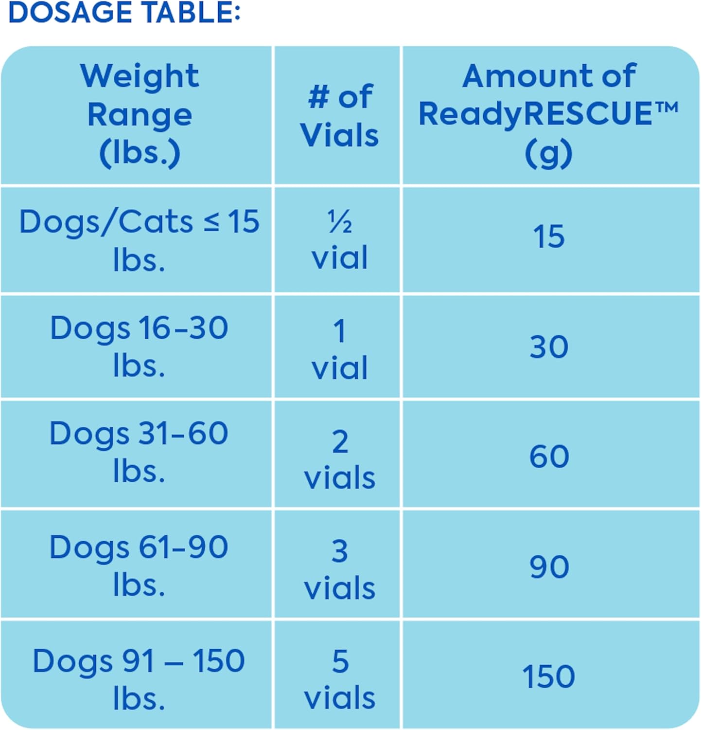EASY EMERGENCY SOLUTION: Worried about your curious puppy eating something dangerous? ReadyRESCUE is a breeze to use! Mix it with pet food, water, or a tasty treat like peanut butter. Quick, easy, and stress-free detox for you when every second counts! This single use vial is recommended for pets 30 lbs and under.