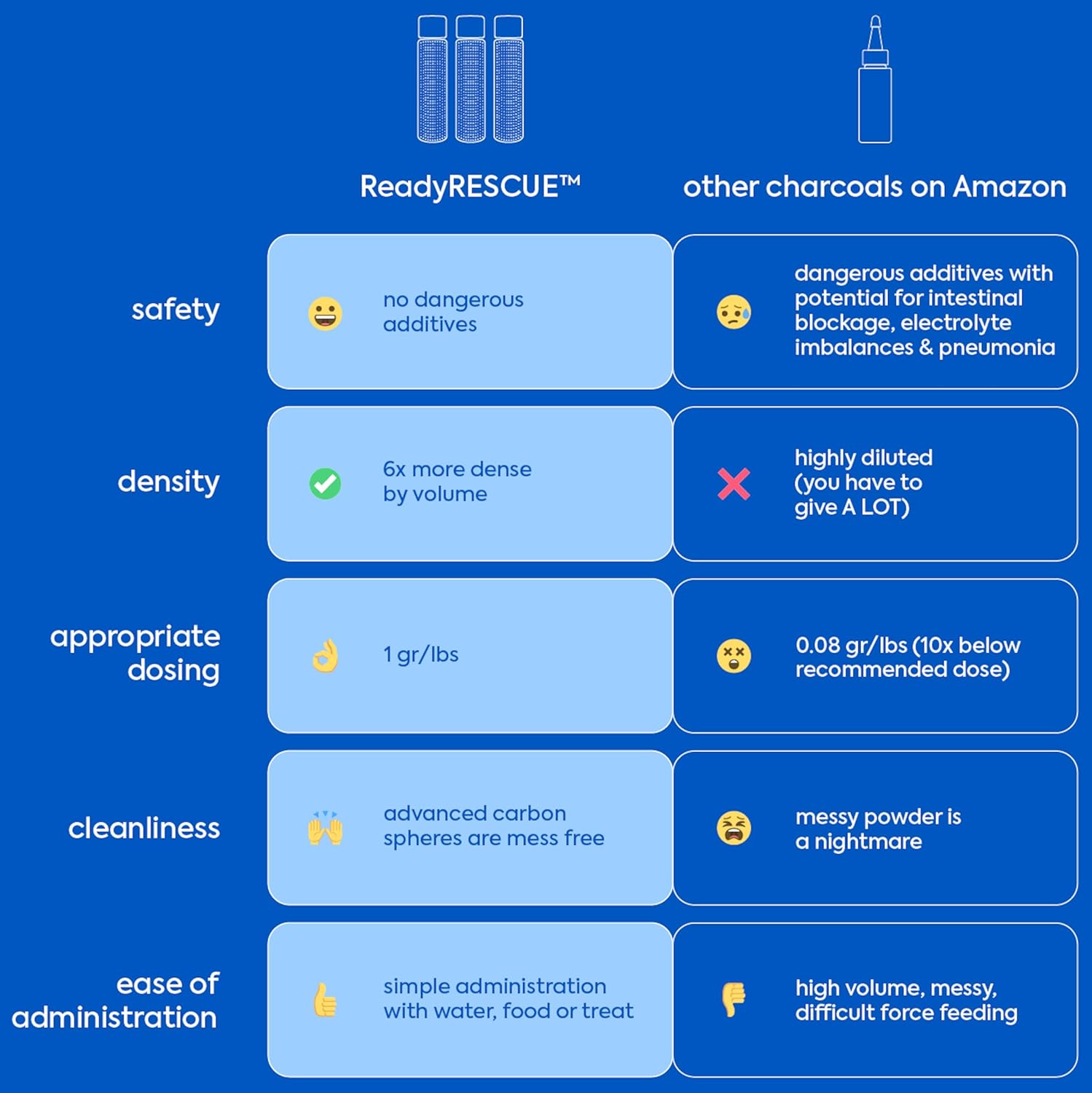 SAFE AND RELIABLE: Worry less about accidental overdoses or false alarms. ReadyRESCUE is completely safe, even if poisoning isn’t confirmed. It passes harmlessly through the GI tract absorbing potential poisons along the way, ensuring your pet’s safety every time.