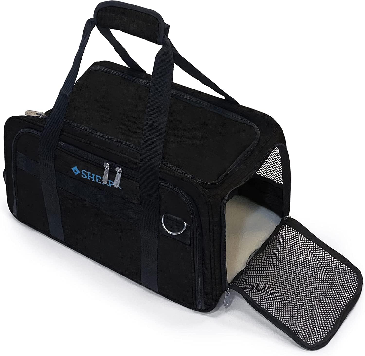 Travel in comfort and style with Sherpa Expandable Pet Carrier. Perfect for traveling by plane or car, for a trip or just to the vet. Patented spring wire frame allows rear of carrier to be pushed down conforming to under-seat requirements. Carrier’s mesh panels offer ventilation, locking zippers for safety load pets. Large side zippered pocket holds your important pet travel needs. Comfortable carrying strap. A soft, cozy, removable, and machine washable faux lambskin liner is included. Sherpa replacement liners are available, sold separately. Approved for use on most major airlines and included in Sherpa’s Guaranteed On-Board Program. Sherpa Travel gives pet parents the best of all worlds: innovative products, stylish designs, and exceptional value with a variety of travel carriers, leads, mats, straps, to meet a pet’s and pet parent’s needs for travel. Sherpa products are designed to meet child safety standards. Please read all packaging instructions, warnings and cautions upon receipt. Packaging contains small parts, discard after opening.