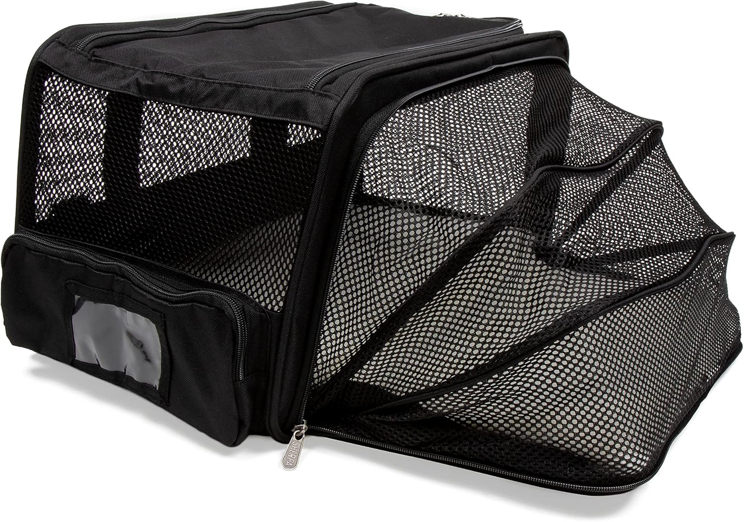 PERFECT FOR TRAVEL: Features mesh panels for ventilation, escape-proof locking zippers, as well as top and side entries for easy and comfortable loading; designed with an expandable size to give your pet more room to stretch out and lounge comfortably